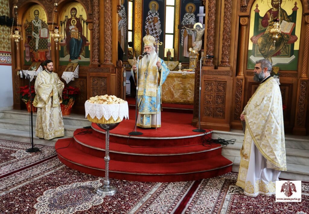Κατακλείοντας την πανηγυρική λατρευτική σύναξη, ο σεπτός Ποιμενάρχης συνεχάρη αρχικά τα παιδιά για την άψογη στάση τους εντός του Ναού. Στη συνέχεια, μίλησε για την πολύτιμη παρακαταθήκη των Τριών Ιεραρχών και για την ανάγκη να επικεντρώσουμε στις πάντα επίκαιρες διδαχές τους, ώστε να επανέλθουμε στον δρόμο της αρετής. Μάλιστα, παρομοίασε τον σύγχρονο άνθρωπο, με κάποιες μινιατούρες που έχουν μεγάλο κεφάλι, μικρό στήθος και πόδια σαν σπιρτόξυλα, αφού κι αυτός έχει πολλές γνώσεις, φτωχά αισθήματα και πόδια ασθενικά που δεν μπορούν να στηρίξουν τα εγχειρήματά του. Ολοκληρώνοντας, ευχήθηκε σε παιδιά και εκπαιδευτικούς να έχουν υγεία, ψυχική και σωματική, καθώς και τη χάρη των Τριών Ιεραρχών, έτσι ώστε, σε πνεύμα συνεργασίας, να συντελέσουν στην δημιουργία μίας νέας, ελπιδοφόρας και δημιουργικής κοινωνίας.