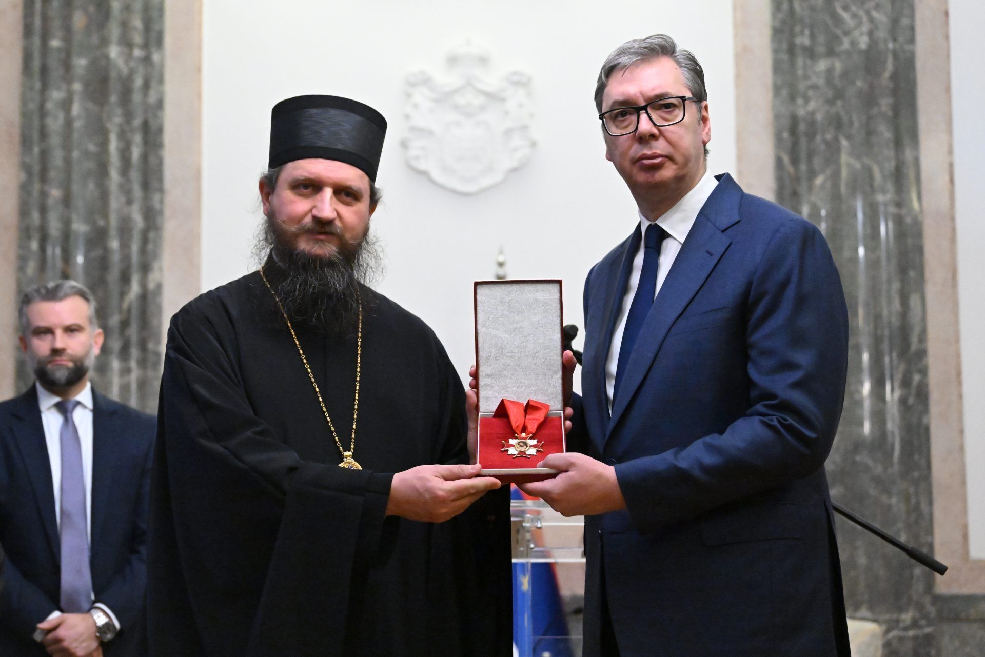 Ο Επίσκοπος Μπίχατς και Πέτροβατς κ. Σέργιος απένειμε, χθες, στον Πρόεδρο της Δημοκρατίας της Σερβίας, κ. Αλεξάνταρ Βούτσιτς, το Παράσημο των Αγίων Νεομαρτύρων Μπίχατς-Πέτροβατς, για την αγάπη και την υλική του βοήθεια στην αποκατάσταση των ιερών της Επισκοπής και ιδιαίτερα για την ιστορική αποκατάσταση της Ιεράς Μονής Αγίου Νικολάου Ρμάνι στο Μάρτιν Μπροντ.