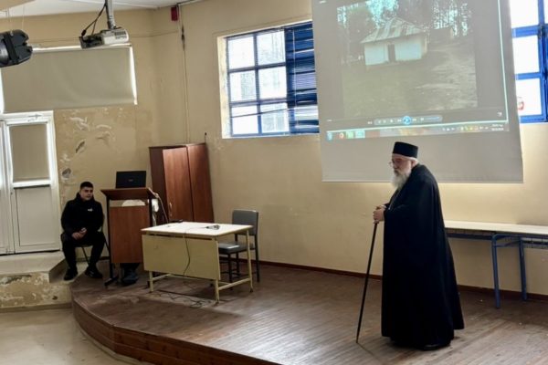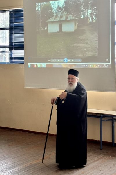 Προχώρησε σε μια σύντομη αλλά περιεκτική ιστορική αναδρομή στην πορεία της Ορθόδοξης Ιεραποστολής στην Υποσαχάρια Αφρική. και μέσα από την προβολή φωτογραφιών και βίντεο, παρουσίασε στιγμές και εμπειρίες από την πρόσφατη μετάβασή του στην Ιερά Επισκοπή Μπουκόμπα, δίνοντας στους μαθητές μια πιο άμεση εικόνα του έργου της Εκκλησίας.