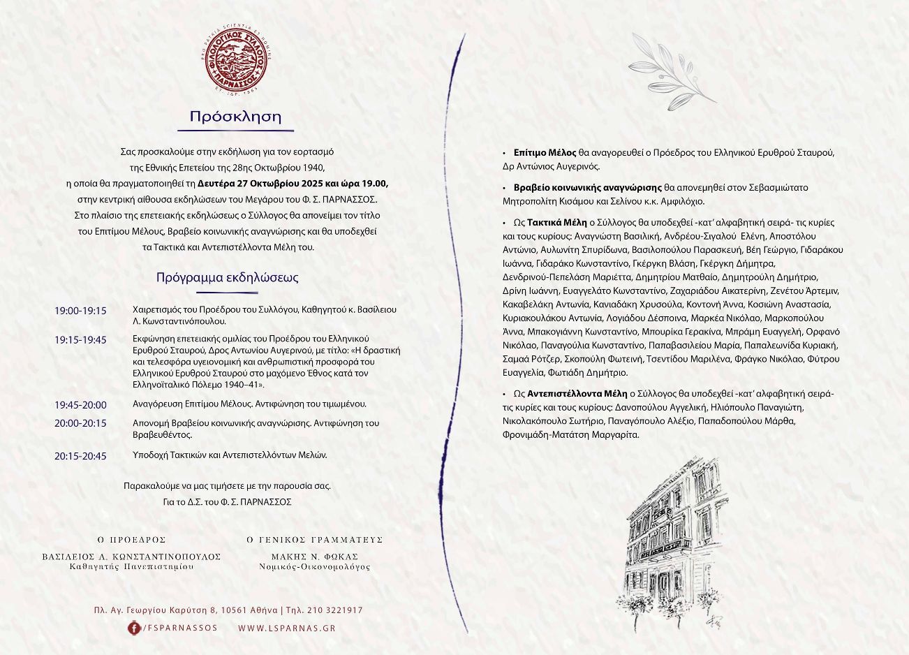 Σε εκδήλωση με αφορμή τον εορτασμό της Εθνικής Επετείου της 28ης Οκτωβρίου, η οποία θα γίνει την Δευτέρα 27 Οκτωβρίου 2025, ο Φιλολογικός Σύλλογος “Παρνασσός” θα τιμήσει τον Σεβασμιώτατο Μητροπολίτη Κισάμου κ. Αμφιλόχιο, απονέμοντάς του Βραβείο κοινωνικής αναγνώρισης.