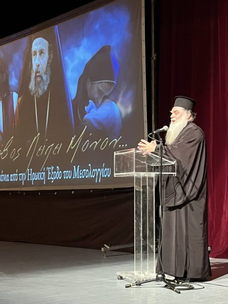 Στην συνέχεια τον λόγο έλαβε ο Αιδεσιμολογιώτατος Πρωτοπρεσβύτερος Κωνσταντίνος Καντάνης, ο οποίος μετέφερε τις ευχές και τις ευχαριστίες του Σεβασμιωτάτου Μητροπολίτου Αιτωλίας και Ακαρνανίας κ. Δαμασκηνού· τις ευχές για την επιτυχία της ταινίας και τις ευχαριστίες για το γεγονός ότι η Κινηματογραφική Ομάδα μιας Βορειοελλαδίτικης ιστορικής Μητροπόλεως ασχολήθηκε με την ένδοξη ιστορία του Μεσολογγίου. Ενημέρωσε δε το κοινό ότι η ταινία αυτή θα ταξιδέψει σε όλη την Ελλάδα μέσω της Επιτροπής Νεότητος της Ιεράς Συνόδου της Εκκλησίας της Ελλάδος, ώστε να την δουν τα παιδιά και οι νέοι μας. Ακολούθησε η προβολή της ταινίας, στην οποία το κοινό ανταποκρίθηκε με ενθουσιασμό, συγκίνηση και παρατεταμένο χειροκρότημα.