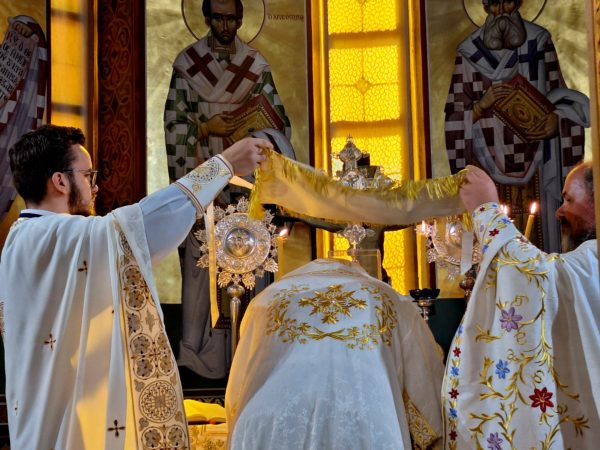 Ο Σεβασμιώτατος, πλαισιωμένος από κληρικούς της Μητροπόλεως, λειτούργησε ενώπιον πλήθους πιστών που προσήλθαν για να συμμετάσχουν στην Ιερά Ευχαριστία και να λάβουν την ευλογία του.