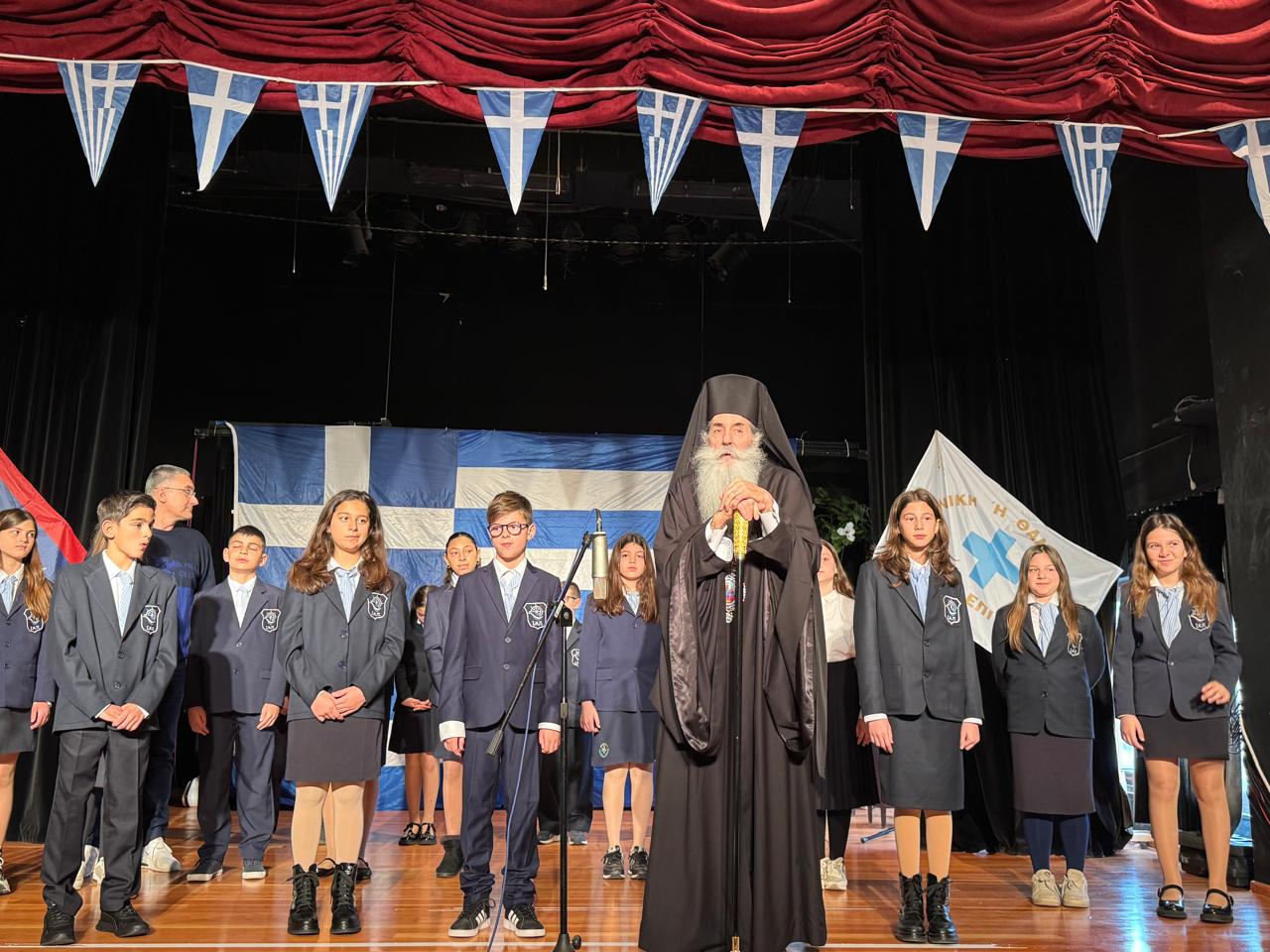 «Θέλουμε τα παιδιά μας να είναι πάντοτε γενναία, δυνατά, ελεύθερα και αξιοπρεπή, όπως ακριβώς μας χάρισαν όλη αυτή την ευλογία οι Μάρτυρες και οι Ήρωές μας, τα ιερά πρόσωπα που παρελαύνουν τη στιγμή αυτή μαζί τους και μαζί μας, να είναι πάντοτε στις καρδιές μας», είπε καταλήγοντας ο Σεβασμιώτατος, ο οποίος νωρίτερα παρακολούθησε επίκαιρο δρώμενο από τους μαθητές της Ε΄ και ΣΤ΄ Δημοτικού στο μεγάλο αμφιθέατρο των Εκπαιδευτηρίων μας.