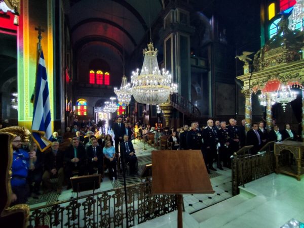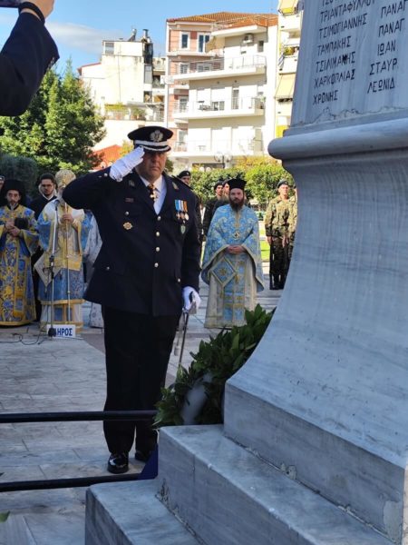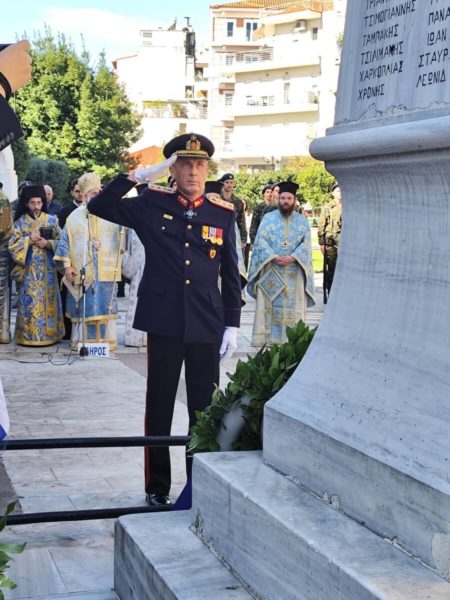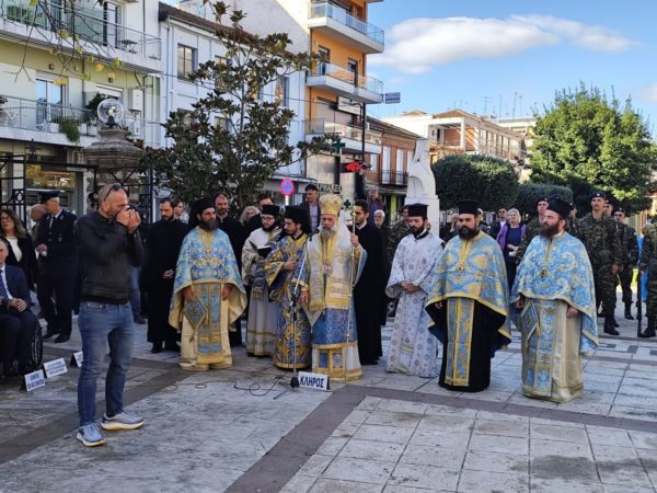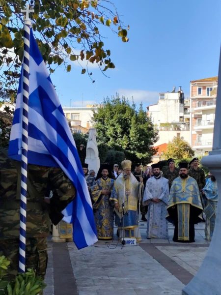 Στη συνέχεια, προέστη της επισήμου Δοξολογίας, η οποία εψάλη μετά το πέρας της Θείας Λειτουργίας, επί τη εθνική επετείω του ΟΧΙ και της επιμνημοσύνου δεήσεως, που έλαβε χώρα στο Ηρώο των πεσόντων στον προαύλιο χώρο του ως άνω Ιερού Μητροπολιτικού Ναού. Έπειτα παρακολούθησε την καθιερωμένη μαθητική και στρατιωτική παρέλαση της πόλεώς μας.