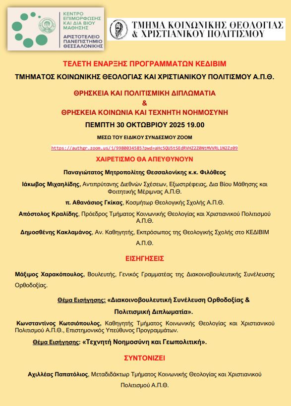 Ο Μητροπολίτης Θεσσαλονίκης κ. Φιλόθεος θα απευθύνει χαιρετισμό στην Τελετή Έναρξης των Προγραμμάτων ΚΕΔΙΒΙΜ του Αριστοτελείου Πανεπιστημίου Θεσσαλονίκης με θέματα: “Θρησκεία, Κοινωνία και Τεχνητή Νοημοσύνη” & “Θρησκεία και Πολιτιστική