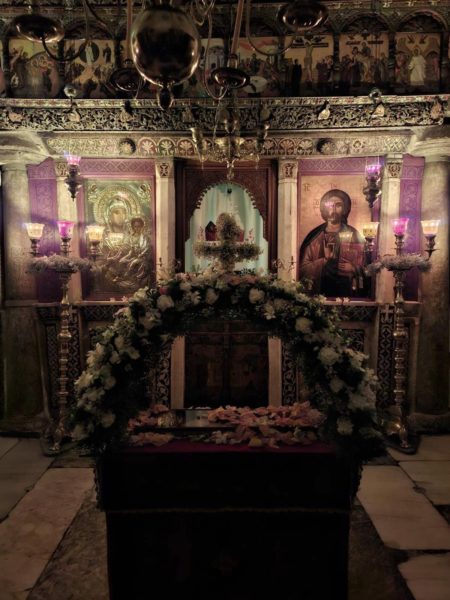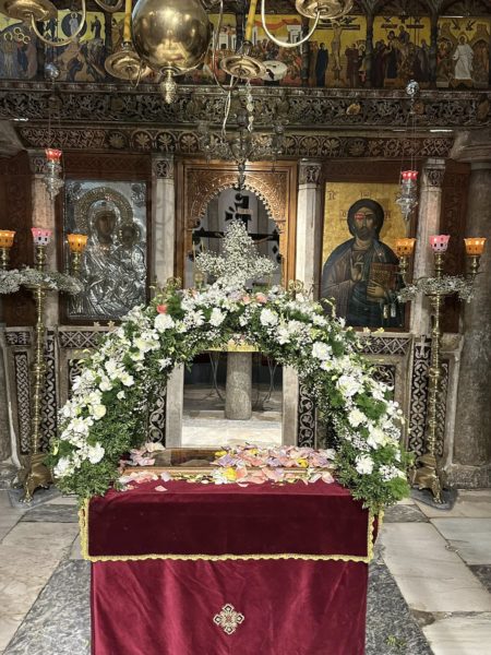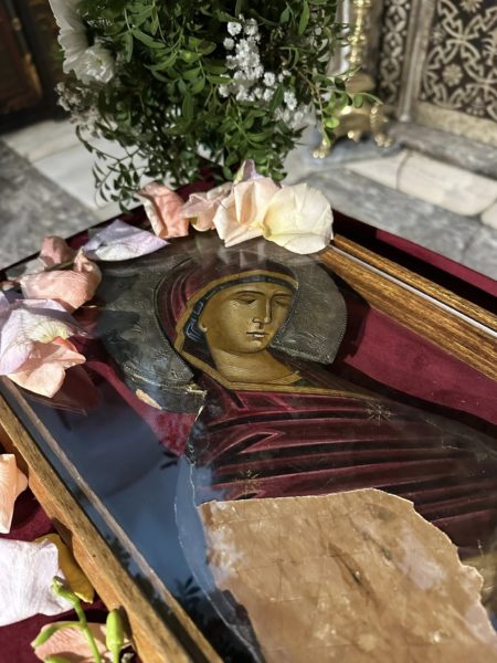Με κατάνυξη και συγκίνηση τελέστηκε την Τετάρτη 13 Αυγούστου στον Ιερό Προσκυνηματικό Ναό Παναγίας της Επισκοπής, στη Μέσα Γωνιά Σαντορίνης, η ακολουθία του Εσπερινού, της Μικρής Παράκλησης και των Εγκωμίων προς την Υπεραγία Θεοτόκο, ενώπιον του θεομητορικού Επιταφίου.