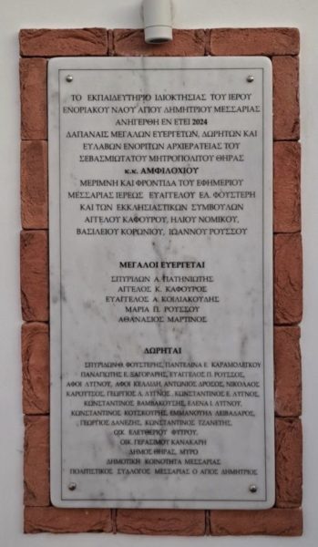 Ο Σεβασμιώτατος συνεχάρη ιδιαιτέρως τον δραστήριο και ακάματο Εφημέριο της Ενορίας, αιδεσιμολ. πρωτοπρ. π. Ευάγγελο Φουστέρη, χάρη στους κόπους και τη φροντίδα του οποίου κατέστη δυνατή η υλοποίηση του έργου. Παράλληλα, εξέφρασε τις θερμές του ευχαριστίες προς όλους τους δωρητές και συντελεστές, ενώ έκανε ιδιαίτερη μνεία στον μεγάλο ευεργέτη της Μεσαριας και της Ιεράς Μητροπόλεως Θήρας κ. Σπυρίδωνα Πατηνιώτη.