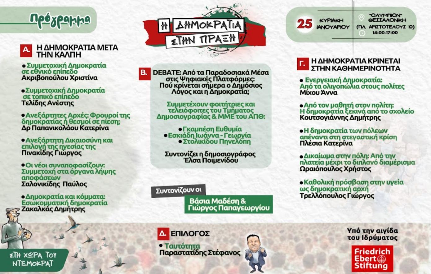 Μετά την επιτυχημένη εκδήλωση στην Αθήνα υπό την αιγίδα του Ιδρύματος Friedrich-Ebert-Stiftung (FES Ελλάδα), με θέμα «Δημοκρατία Vs Αυταρχισμός: η σύγκρουση που θα κρίνει το μέλλον», ο Ντέμοκρατ συνεχίζει τον δημόσιο διάλογο για τις μεγάλες δημοκρατικές προκλήσεις της εποχής μας και μεταφέρει τη συζήτηση στη Θεσσαλονίκη, την Κυριακή 25 Ιανουαρίου στο Ολύμπιον (Πλατεία Αριστοτέλους), από τις 14:00 έως τις 17:00.