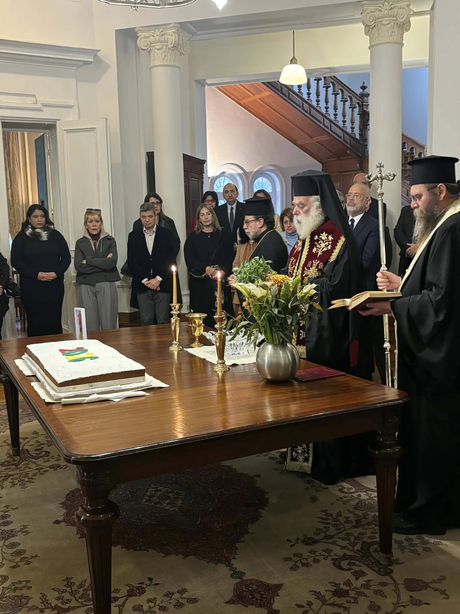 Η Πρεσβεία, για άλλη μία χρονιά, υποδέχθηκε με ιδιαίτερη χαρά και τιμή τον Πατριάρχη Αλεξανδρείας και συνεόρτασε το παραδοσιακό έθιμο με στελέχη των ελληνικών Διπλωματικών Αρχών στην Αίγυπτο, εκπροσώπους και μέλη φορέων της Ομογένειας, εκπαιδευτικούς των ελληνικών σχολείων Καΐρου κ.ά.
