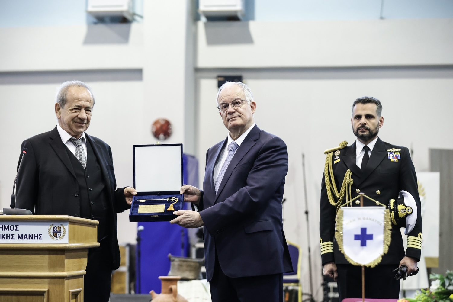 Μετά τη δοξολογία που τελέσθηκε στον Ιερό Ναό Παμμεγίστων Ταξιαρχών, προεξάρχοντος του Μητροπολίτη Μάνης κ. Χρυσοστόμου Γ’, μετέβη στο Κλειστό Γυμναστήριο Αρεόπολης, όπου ανακηρύχθηκε επίτιμος δημότης Ανατολικής Μάνης.
