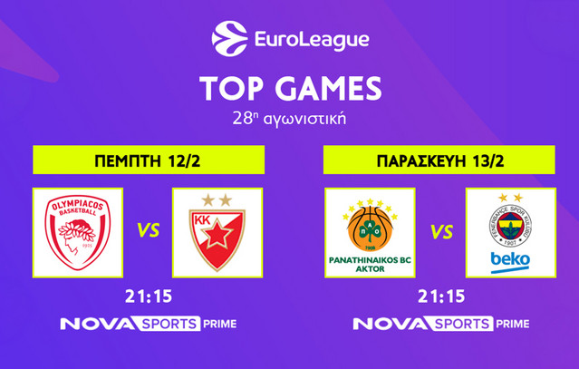 Στην κορυφαία ευρωπαϊκή διασυλλογική διοργάνωση, στην EuroLeague και για την 28η αγωνιστική, o Ολυμπιακός υποδέχεται στο ΣΕΦ τον Ερυθρό Αστέρα (12/2, 21:15), ενώ ο Παναθηναϊκός AKTOR θα αντιμετωπίσει στο κλειστό του ΟΑΚΑ την Φενέρμπαχτσε (13/2, 21:15).