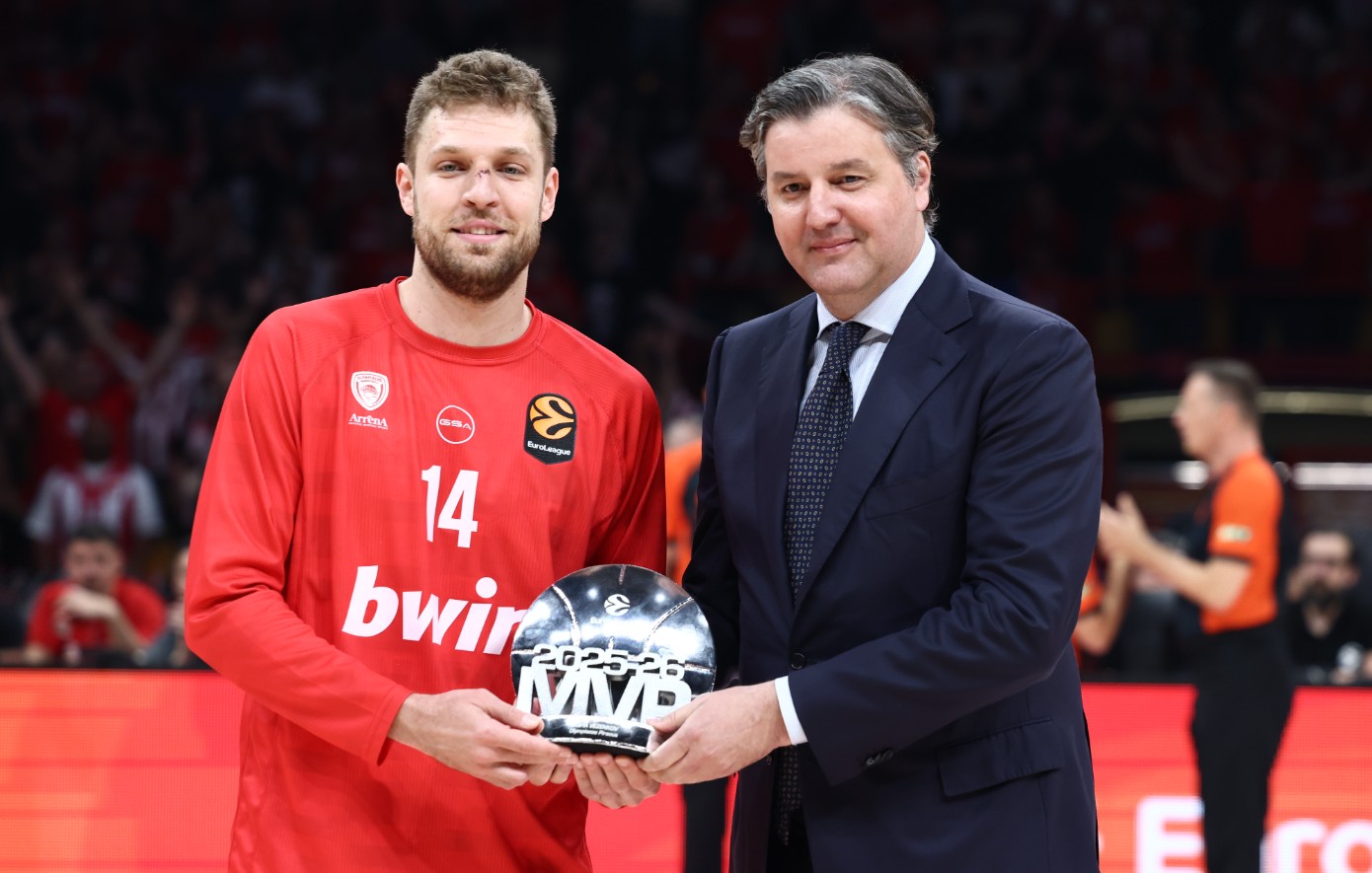 Ο Σάσα Βεζένκοβ αναδείχθηκε MVP της κανονικής περιόδου της Euroleague και ο Ντέγιαν Μποντιρόγκα του έδωσε το βραβείο, πριν την έναρξη του δεύτερου αγώνα του Ολυμπιακού με τη Μονακό για τα play off.