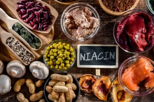 - Βιταμίνη Β3 (νιασίνη): Βοηθά στη βελτίωση της λειτουργίας φραγμού του δέρματος και μπορεί να μειώσει τα σημάδια γήρανσης, όπως χαλάρωση.