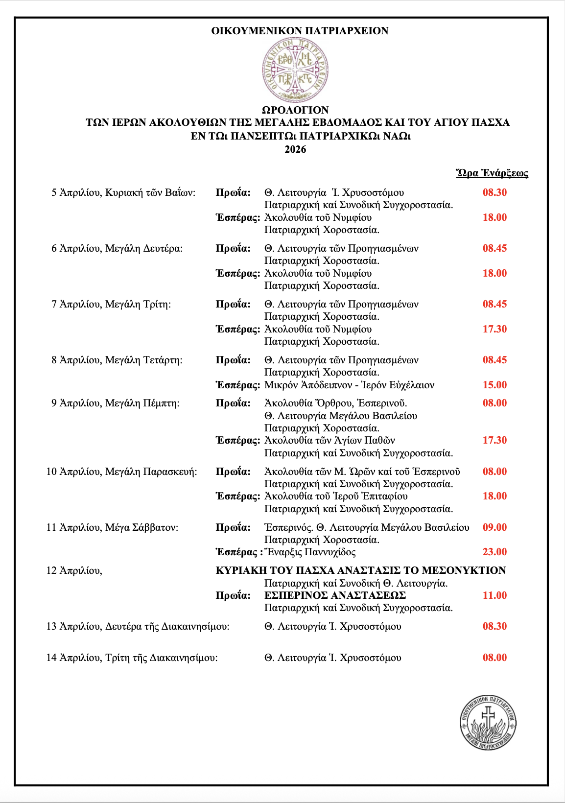 Ωρολόγιον των Ιερών Ακολουθιών της Μεγάλης Εβδομάδος και του Αγίου Πάσχα στον Πάνσεπτο Πατριαρχικό Ναό