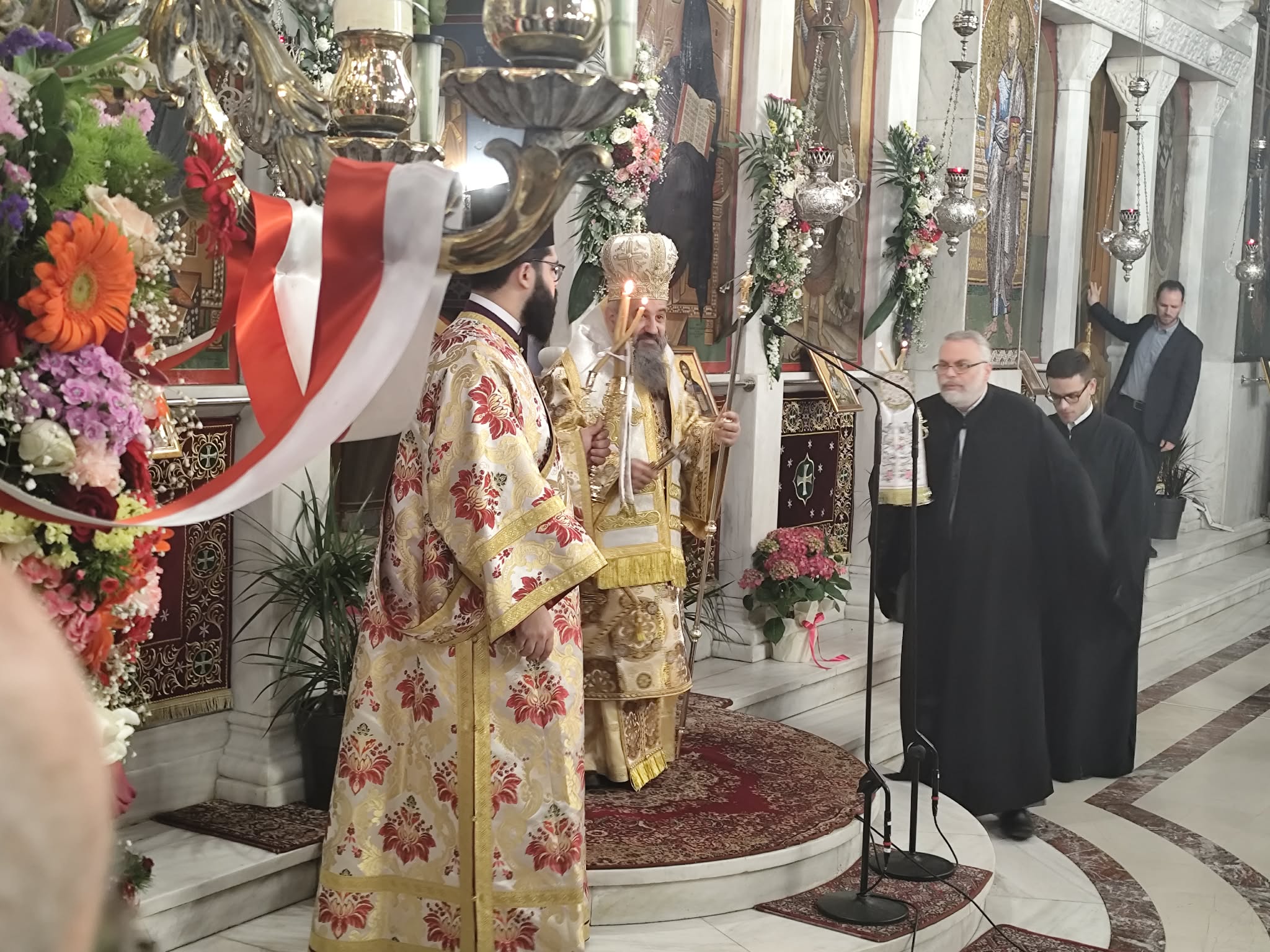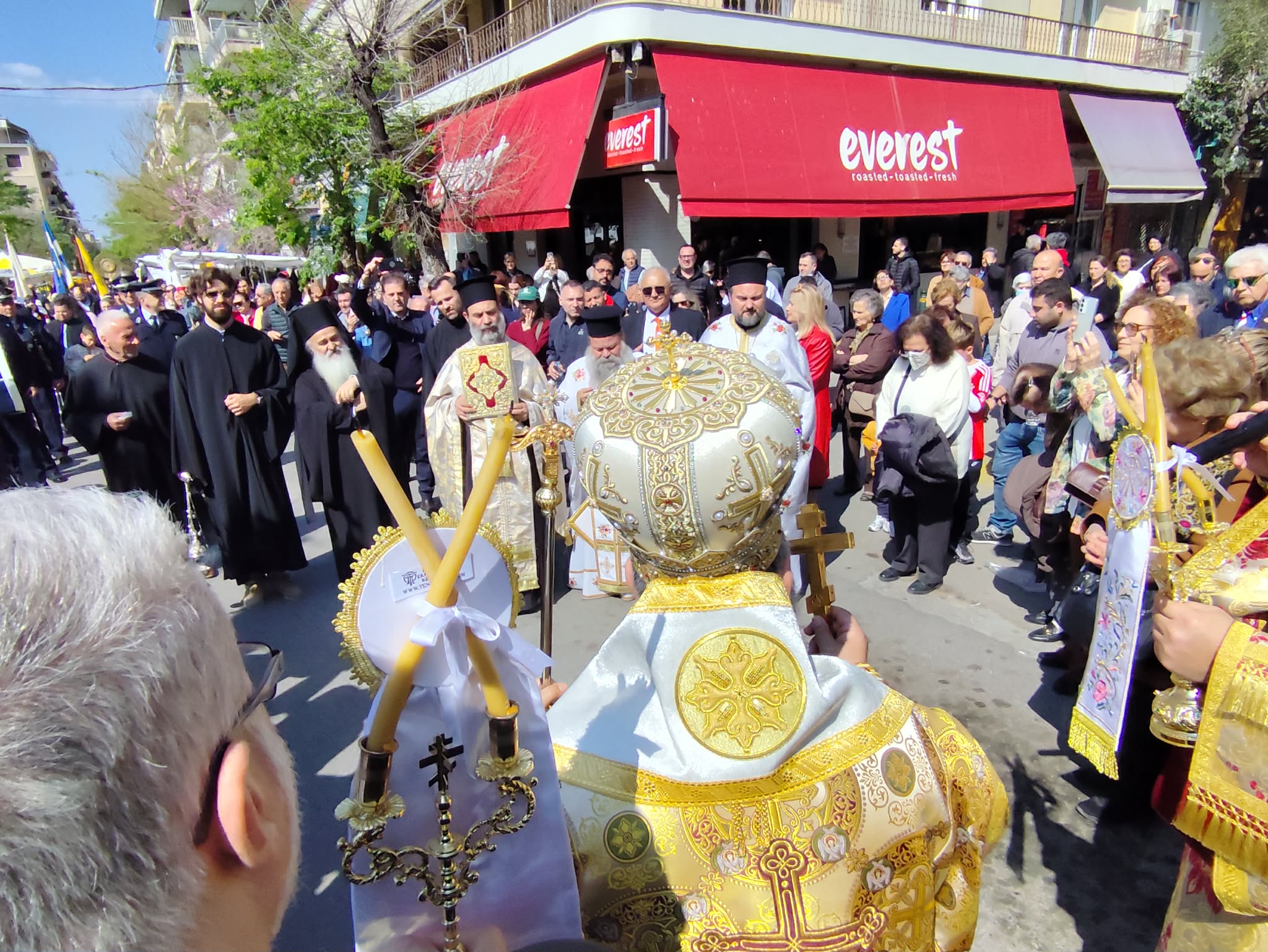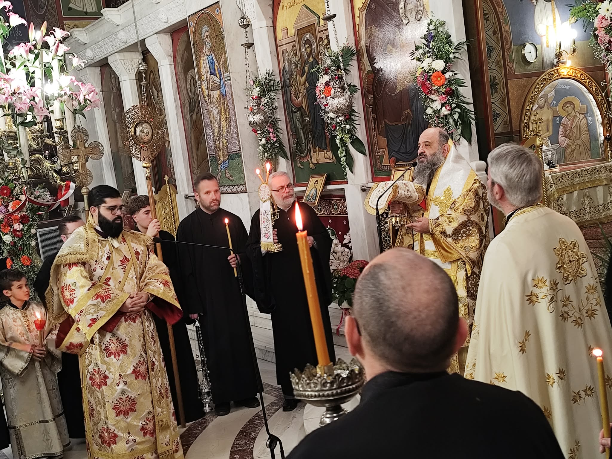 Με την επάνοδο της εικόνας στην εκκλησία, ο σεπτός Επίσκοπος Σκιάθου κ.κ. Ιωάννης αφού μετέφερε το κατάφορτο από χριστιανική αγάπη μήνυμα του Αρχιεπισκόπου Αθηνών και πάσης Ελλάδος κ.κ. Ιερωνύμου – που καλούσε ως στοργικός ποιμήν το χριστεπώνυμο πλήθος, να ξεπεράσει τις δυσπιστίες και τις πλάνες της παθογενούς εποχής μας και να αγκαλιάσει την εκκλησία του Χριστού μας, που είναι η μοναδική αληθινή πηγή θαλπωρής και αγάπης – διεκήρυξε μαζί με τις ηθικά ευγενείς και χριστιανικές ευχές του, την αδήριτη ανάγκη περισσότερο από άλλοτε σήμερα, να εδραιώσουμε και να διαφυλάξουμε την πίστη μας, που αποτελεί στην μακρά ελληνική διαχρονία, την τιμαλφή ηθική και πολιτισμική μήτρα του μαρτυρικού ελληνικού λαού. Στην αντιφώνησή του ο σεπτός πατέρας Αλέξιος, που με την ξεχωριστή φροντίδα και αγάπη του επιμελήθηκε την μεγαλοπρεπή εορτή, ευχαρίστησε το φιλόπτωχο ταμείο, τις κυρίες της ερανικής επιτροπής, τις εθελόντριες και τους εθελοντές που δούλεψαν αγόγγυστα για την άρτια υλοποίηση της ιεράς πανηγύρεως, την Φιλαρμονική της Ελληνικής Αστυνομίας, για την ευγενική συμμετοχή της, την Ελληνική Αστυνομία, για τα άψογα μέτρα τάξης και όλους τους ευλαβείς χριστιανούς, που με την αγάπη τους πύργωσαν, τη έξοχη αυτή χριστιανική εορτή.