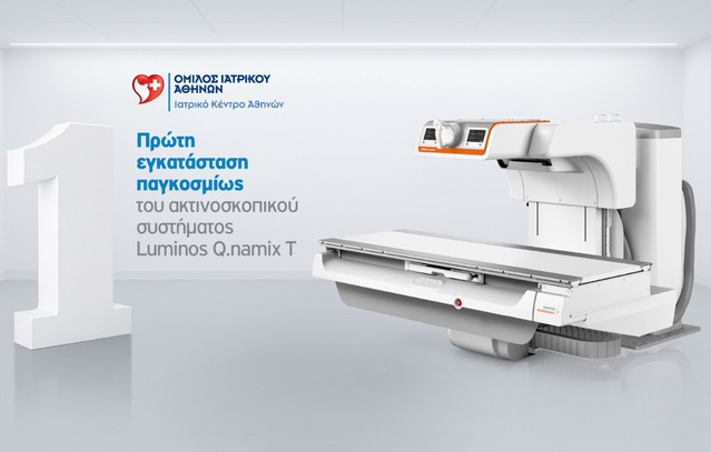 Ο Όμιλος Ιατρικού Αθηνών, πάντα ένα βήμα μπροστά στις εξελίξεις της ιατρικής τεχνολογίας, ανακοινώνει την πρώτη παγκοσμίως εγκατάσταση της νέας γενιάς ακτινοσκοπικού συστήματος Luminos Q.namix T, καθώς και την πρώτη εγκατάσταση στη Νότια Ευρώπη του ακτινοσκοπικού συστήματος Q.namix R της Siemens Healthineers στο Ιατρικό Κέντρο Αθηνών.