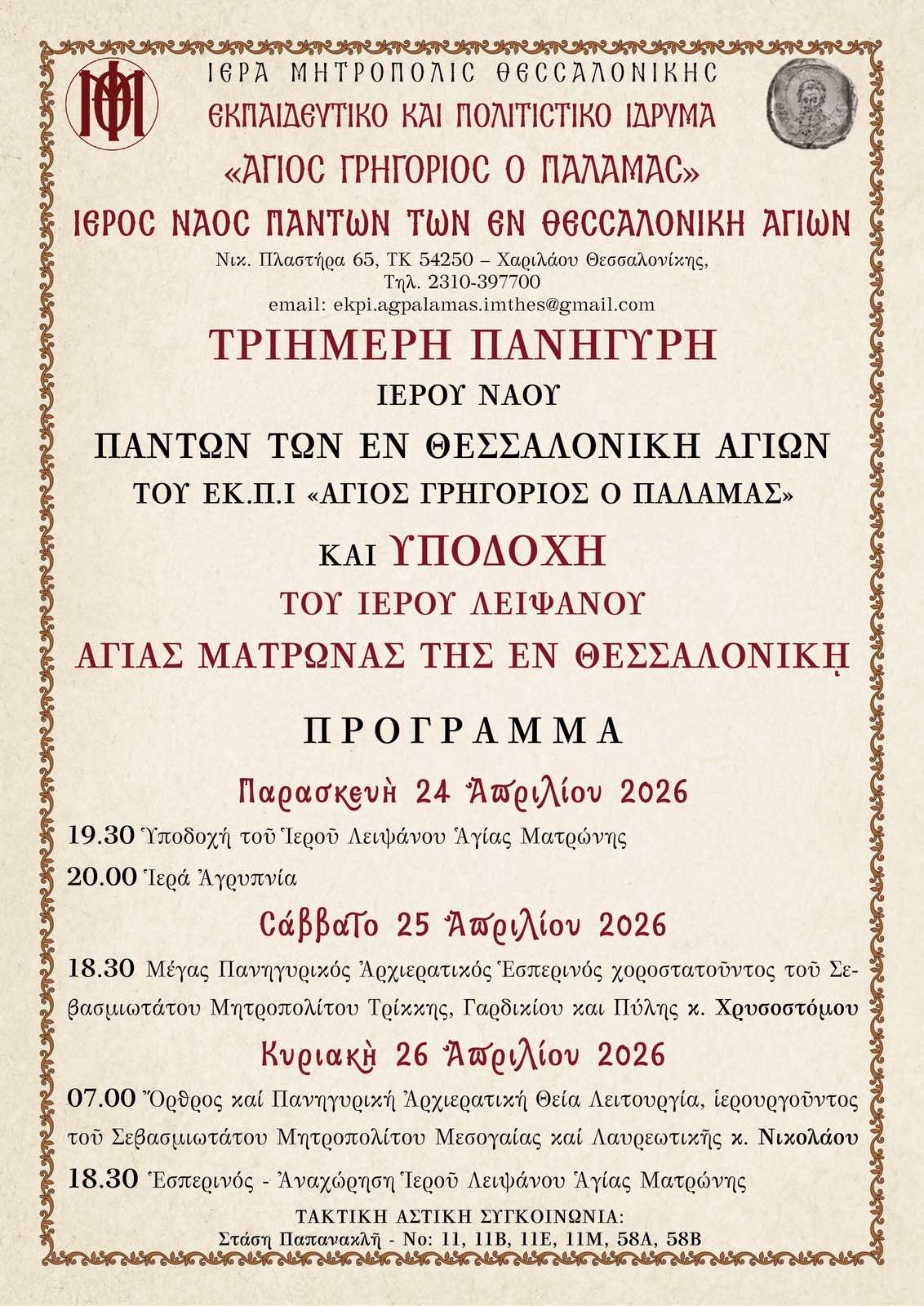 Κατόπιν τούτου και μετά πολλής της χαράς, ανακοινώνεται, ότι κατά το διήμερο Σάββατο 25 και Κυριακή, 26 Απριλίου 2026, πανηγυρίζει επί τη εορτή της Συνάξεως πάντων των εν Θεσσαλονίκη Αγίων, ο σε αυτούς αφιερωμένος και τιμώμενος Ιερός Ναός, που ευρίσκεται εντός του χώρου του Εκπαιδευτικού και Πολιτιστικού Ιδρύματος της Ιεράς Μητροπόλεως Θεσσαλονίκης «Άγιος Γρηγόριος ο Παλαμάς» (Νικολάου Πλαστήρα 65 – Χαριλάου).