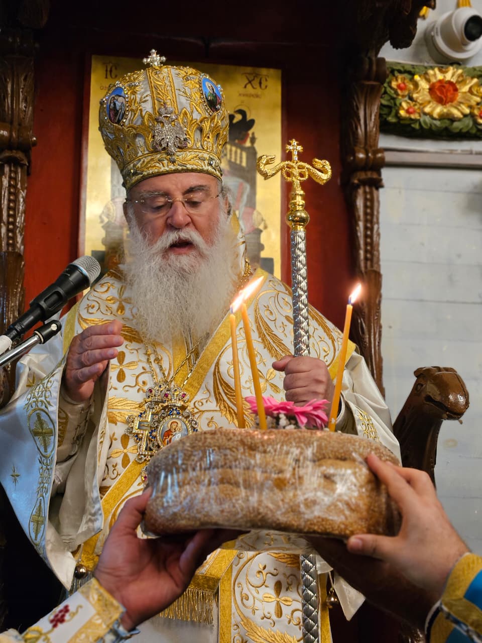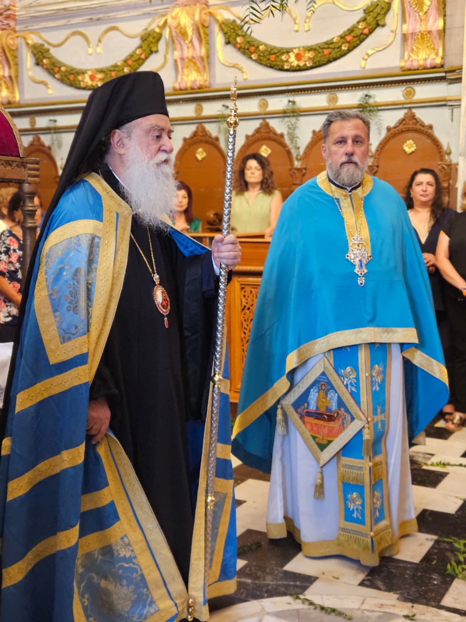 Κατά τα ειθισμένα της Ενορίας, μετά την ευλόγηση των Άρτων και τα Απόστιχα, του Αρχιερέως και των Ιερέων φερόντων άπασα την στολή τους, λιτανεύτηκε το άπνουν “σώμα” της Παναγίας τρις εντός του Ναού, ψαλλομένης της γ΄ στάσεως των θεομητορικών Εγκωμίων: “Αι γενεαί πάσαι ύμνον τη ταφή σου προσφέρομεν Παρθένε […] Αι γενεαί πάσαι μακαρίζομέν Σε την μόνην Θεοτόκον […]” κλπ. Τέλος, κατά την ώρα του Απολυτικίου “Εν τη γεννήσει την παρθενίαν εφύλαξας…”, κρουομένων των καμπανών του Καμπαναρίου, το πανίερο “Σώμα” εναπετέθη στον Επιτάφιο, ο δε Αρχιερέας προσέφερε άνθη και μύρα, εκφράζοντας έτσι την τιμή και τον σεβασμό όλων στην εν τω τάφω Μητέρα του Θεού και των Ανθρώπων!