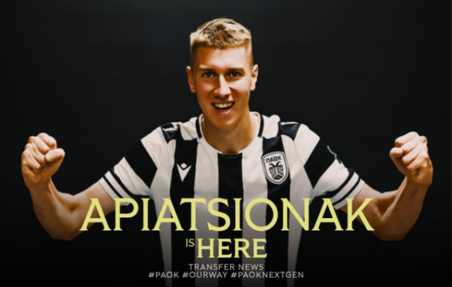 «Με το βλέμμα στο μέλλον. Η ΠΑΕ ΠΑΟΚ ανακοινώνει την απόκτηση του Λευκορώσου αμυντικού Πάβελ Απιατσιόνακ από τη Ντιναμό Μινσκ. Ο Απιατσιόνακ υπέγραψε συμβόλαιο συνεργασίας με τον Δικέφαλο για τα επόμενα τέσσερα χρόνια και θα φοράει την φανέλα με τον αριθμό 15.