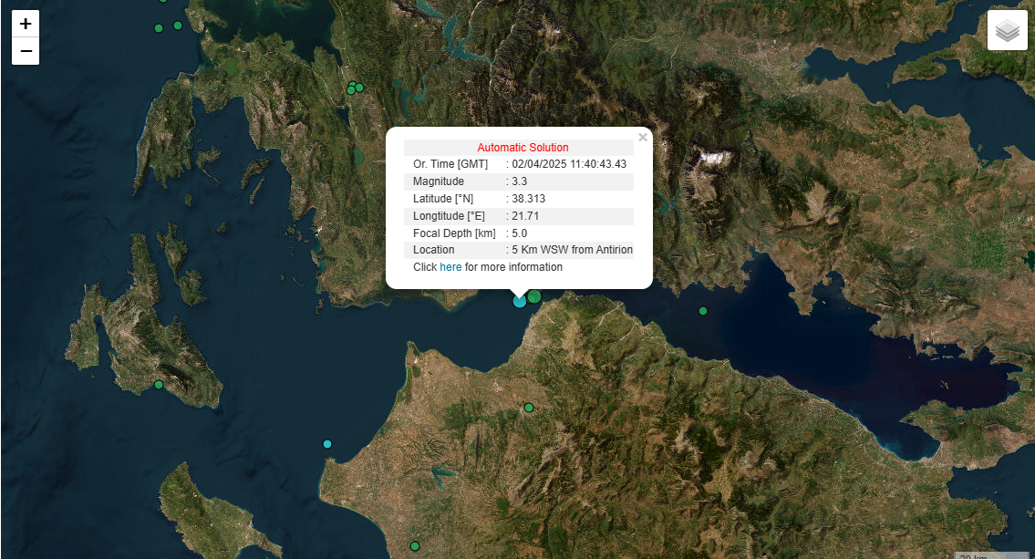 Το μέγεθος του σεισμού, σύμφωνα με το Γεωδυναμικό Ινστιτούτο του Εθνικού Αστεροσκοπείου Αθηνών, είναι στους 3.3 βαθμούς της κλίμακας Ρίχτερ, το επίκεντρο βρίσκεται 4 χιλιόμετρα δυτικά, νοτιοδυτικά του Αντιρρίου και το εστιακό βάθος υπολογίζεται στα 5 χιλιόμετρα.