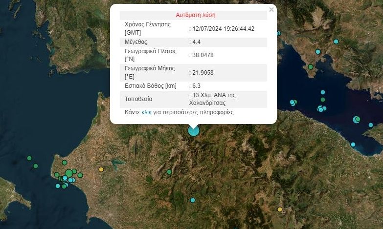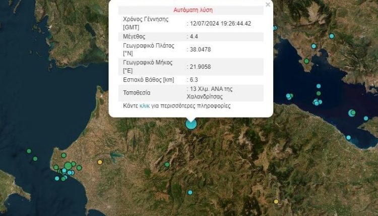 Πάτρα: Σεισμός αισθητός στην Χαλανδρίτσα Share Ισχυρός σεισμός ταρακούνησε την Αχαΐα – Κοντά στην Χαλανδρίτσα το επίκεντρο Σεισμική δόνηση μεγέθους 4,5 Ρίχτερ σημειώθηκε λίγα λεπτά πριν από τις 22:30 το βράδυ της Παρασκευής στη Χαλανδρίτσα Αχαϊας. Ο σεισμός είχε εστιακό βάθος 6,4 χλμ. Share FacebookTwitterGoogle+ReddItWhatsAppPinterestΗΛΕΚΤΡΟΝΙΚΗ ΔΙΕΥΘΥΝΣΗ