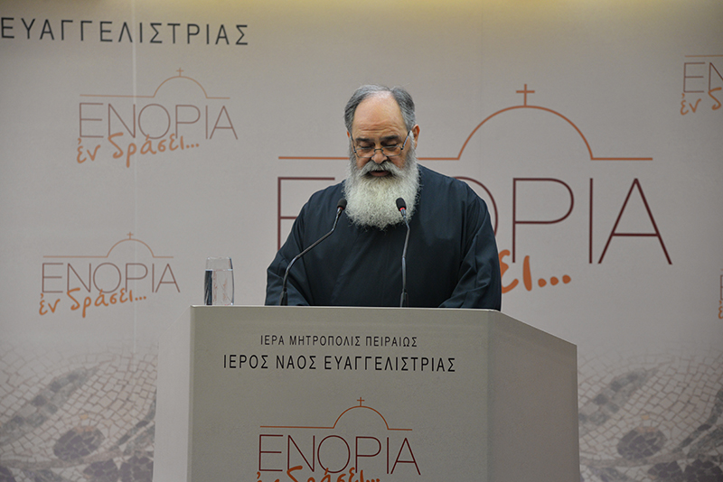 Καλωσορίζοντας τους προσκεκλημένους, ο Προϊστάμενος του Ιερού Ναού Ευαγγελιστρίας Πειραιώς και εμπνευστής του προγράμματος «ΕΝΟΡΙΑ εν δράσει…» Πρωτοπρεσβύτερος π. Γεώργιος Γεωργακόπουλος, αναφέρθηκε συνοπτικά στις δεκάδες δράσεις που απαρτίζουν το πρόγραμμα της τρέχουσας χρονιάς, ενός θεσμού που εδώ και χρόνια «αποτελεί ζωντανή απόδειξη ότι η Εκκλησία μας δεν είναι μόνο χώρος λατρείας, αλλά και κοινότητα αγάπης, συνάντησης και δημιουργίας».