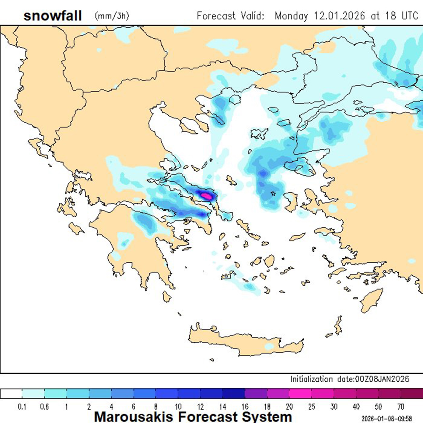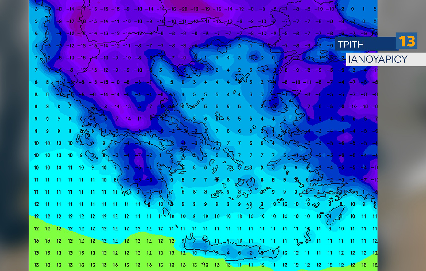Μέσα στην Κυριακή, πολική αέρια μάζα θα κατηφορίσει προς τη χώρα μας δίνοντας χιόνια ακόμα και χαμηλά. Πιθανόν ο χιονιάς να φτάσει μέχρι και τα χαμηλά της Αττικής, ενώ τα χιόνια θα κάνουν την εμφάνισή τους και πάνω από τη θάλασσα του Αιγαίου, ντύνοντας νησιά μας στα λευκά, ενώ και η Εύβοια θα δει αρκετό χιόνι μέχρι και χαμηλά, όπως και τα ορεινά – ημιορεινά της Κρήτης. Χαρακτηριστικός ο τέταρτος χάρτης μας.