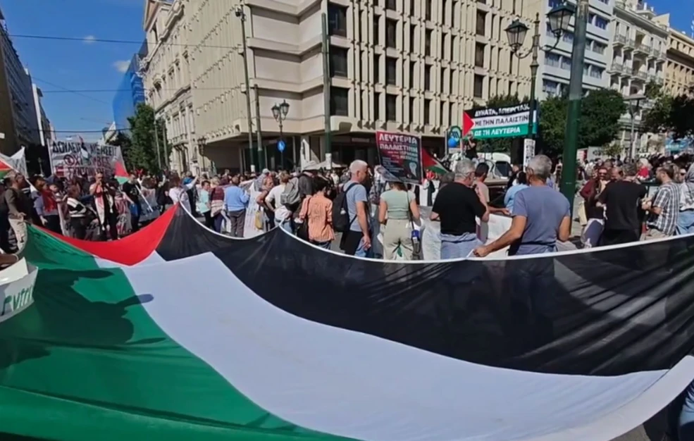 Φορείς, οργανώσεις και σωματεία πραγματοποίησαν συγκέντρωση στην πλατεία Κλαυθμώνος και πορεία προς τη Βουλή, εκφράζοντας την αλληλεγγύη τους στον παλαιστινιακό λαό.