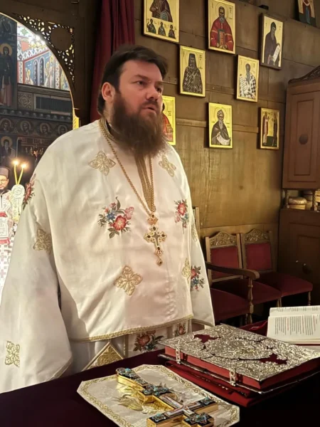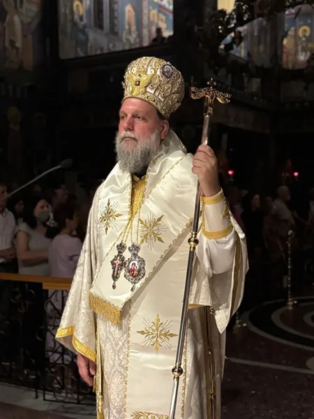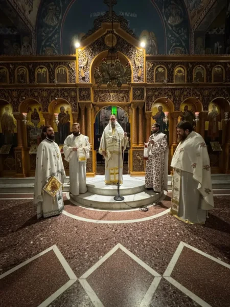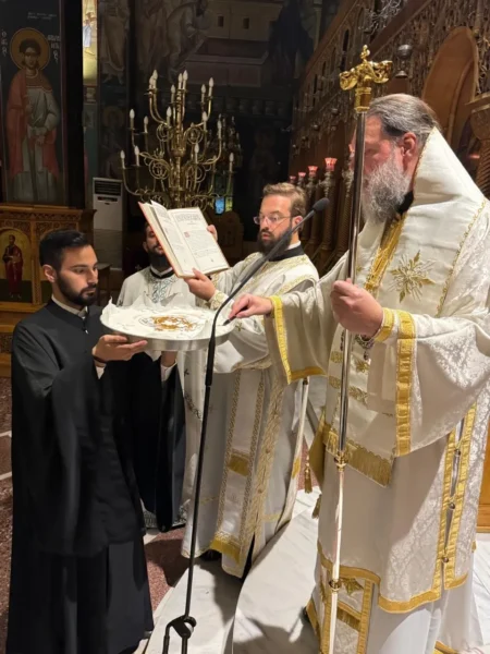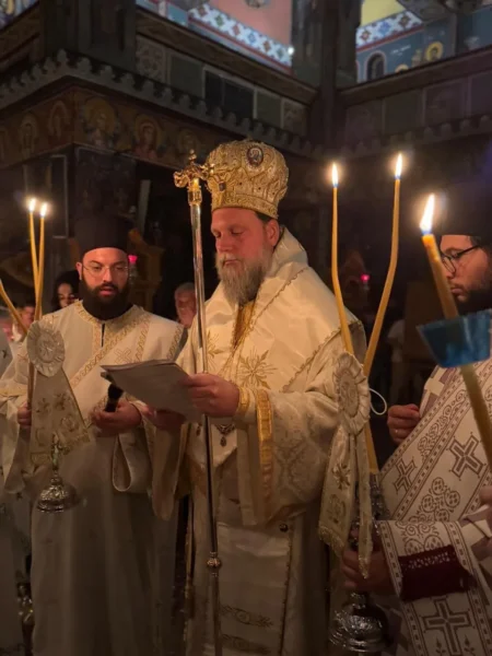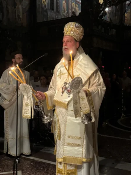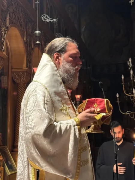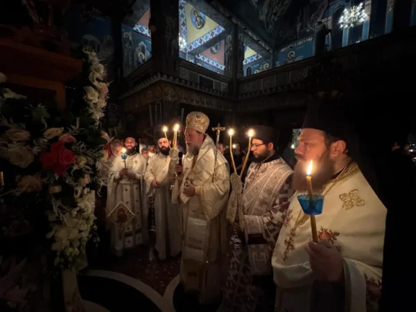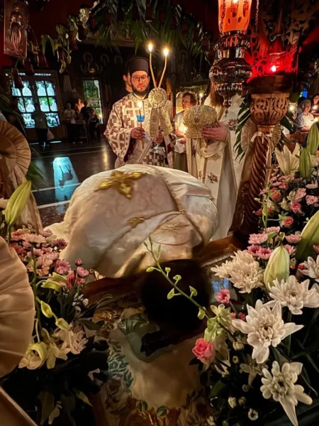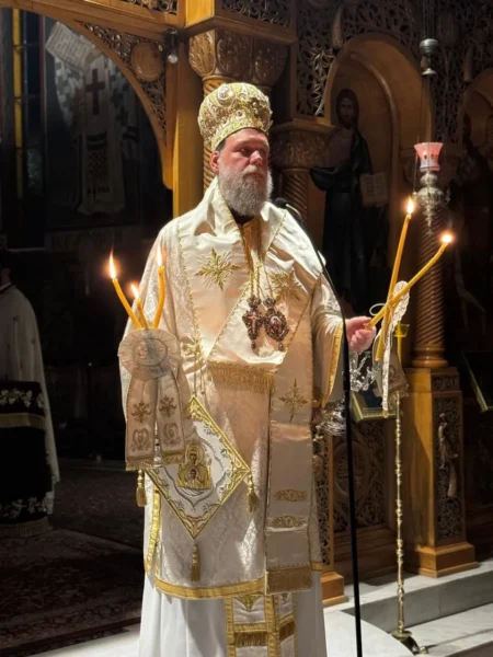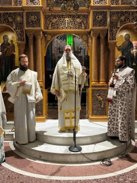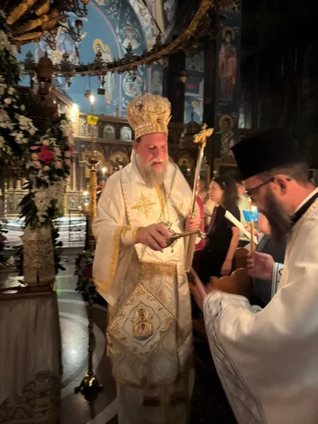 Ο Σεβασμιώτατος χοροστάτησε στην ακολουθία του Όρθρου, του Επιταφίου Θρήνου και των Εγκωμίων προς την Υπεραγία Θεοτόκο και στη συνέχεια τέλεσε την Αρχιερατική Θεία Λειτουργία, πλαισιωμένος από κληρικούς της Ιεράς Μητροπόλεως.