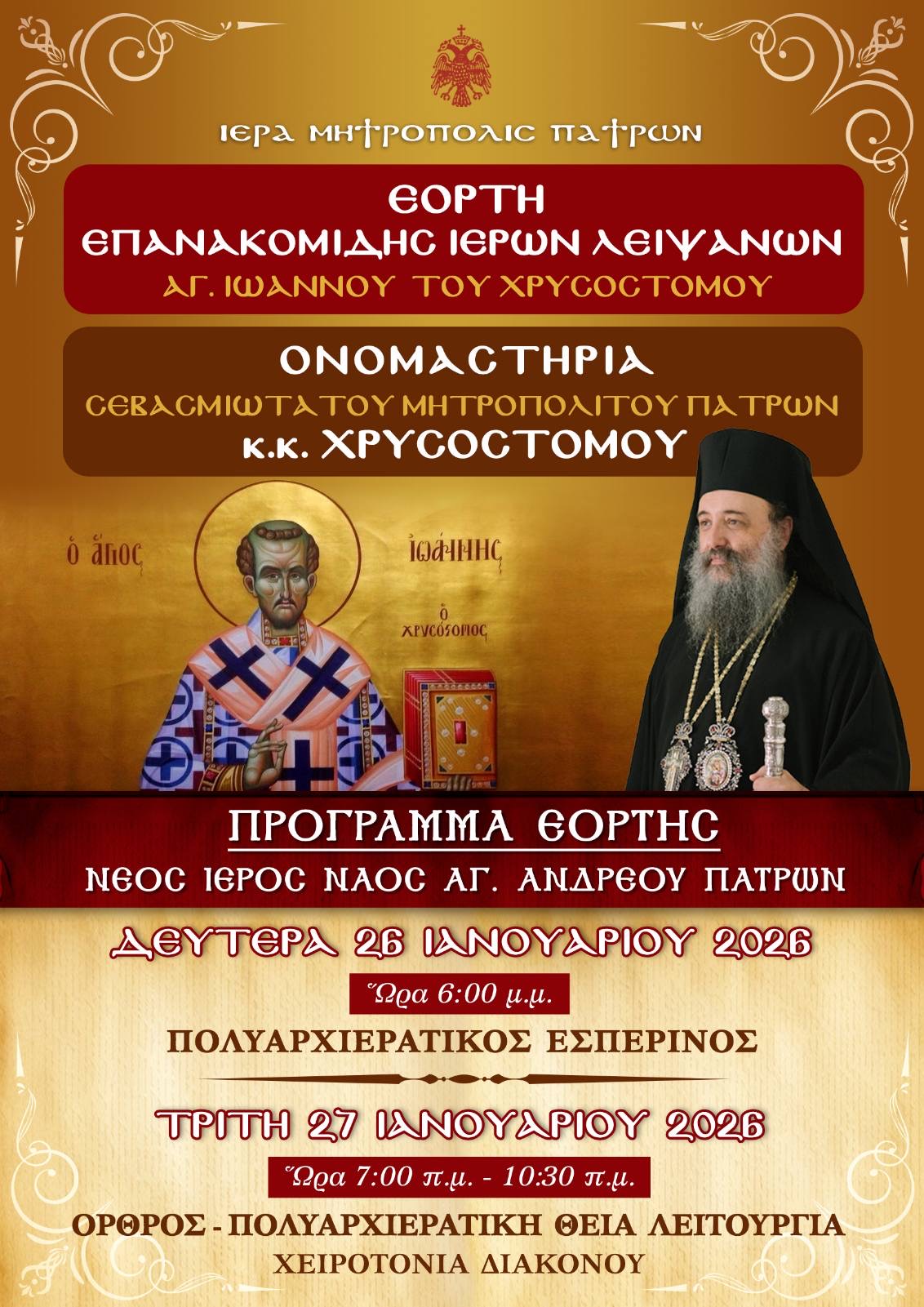 Ο εορτασμός του μεγάλου πατρός και διδασκάλου της Αγίας μας Εκκλησίας, Αγίου Ιωάννου του Χρυσοστόμου, θα πραγματοποιηθεί στον Νέο Ιερό Ναό Αγίου Ανδρέου Πατρών, κατά το εξής Πρόγραμμα.