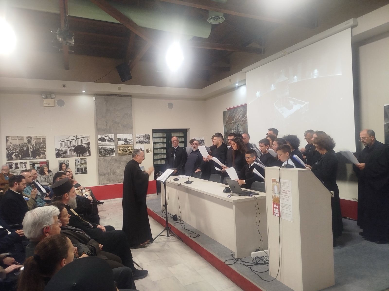 Την εκδήλωση πλαισίωσαν με ξεχωριστό τρόπο τα μέλη της Βυζαντινής Εκκλησιαστικής Σχολής της Ιεράς Μητροπόλεως «Άγιος Γεώργιος ο Νεαπολίτης», τα οποία, υπό τη διεύθυνση του χοράρχου κ. Θεοδώρου Καλλιμάχου, απέδωσαν με ενάργεια και κατάνυξη βυζαντινούς ύμνους και τροπάρια της Μεγάλης Εβδομάδος.