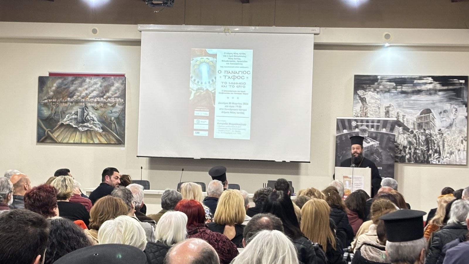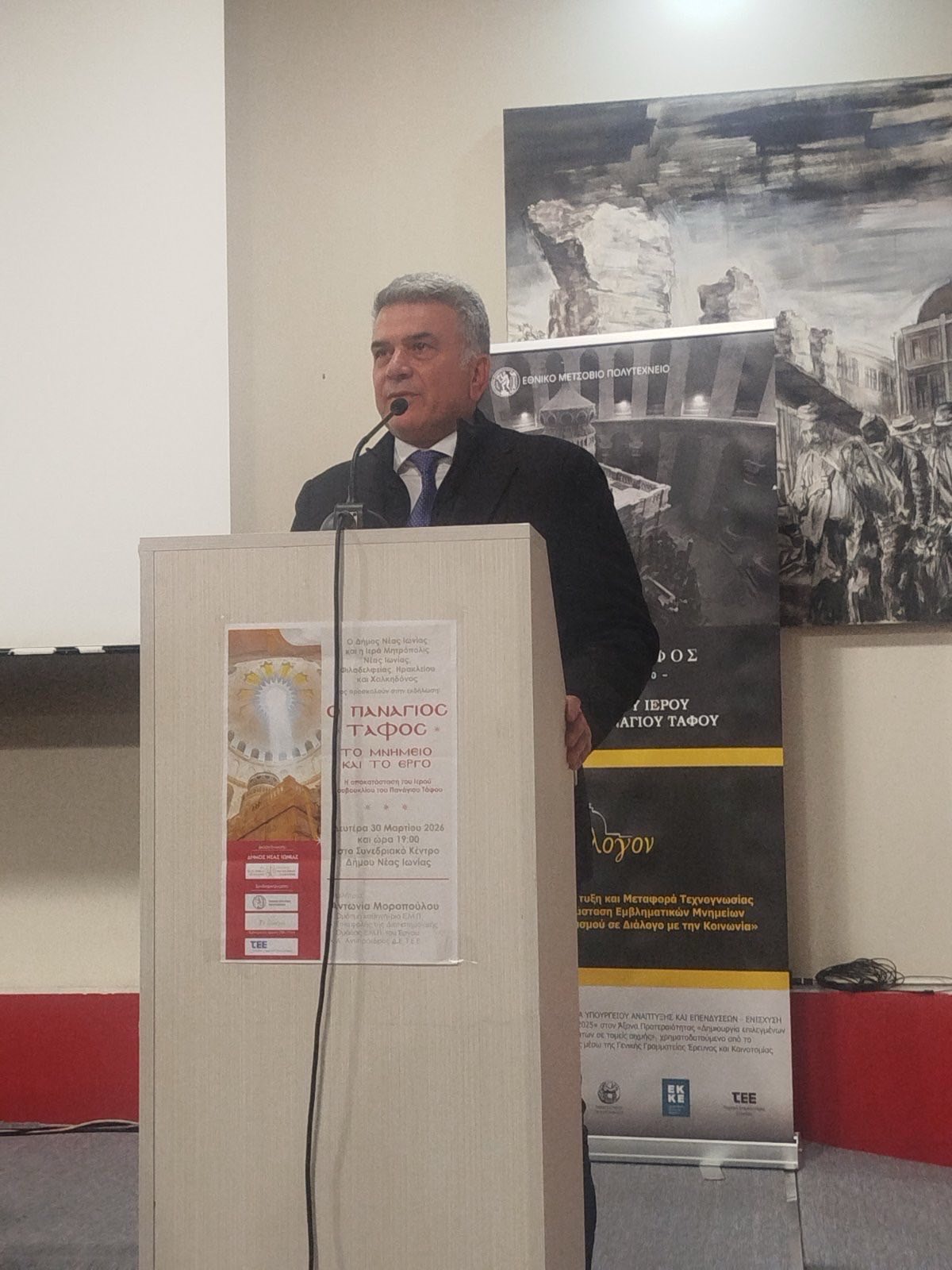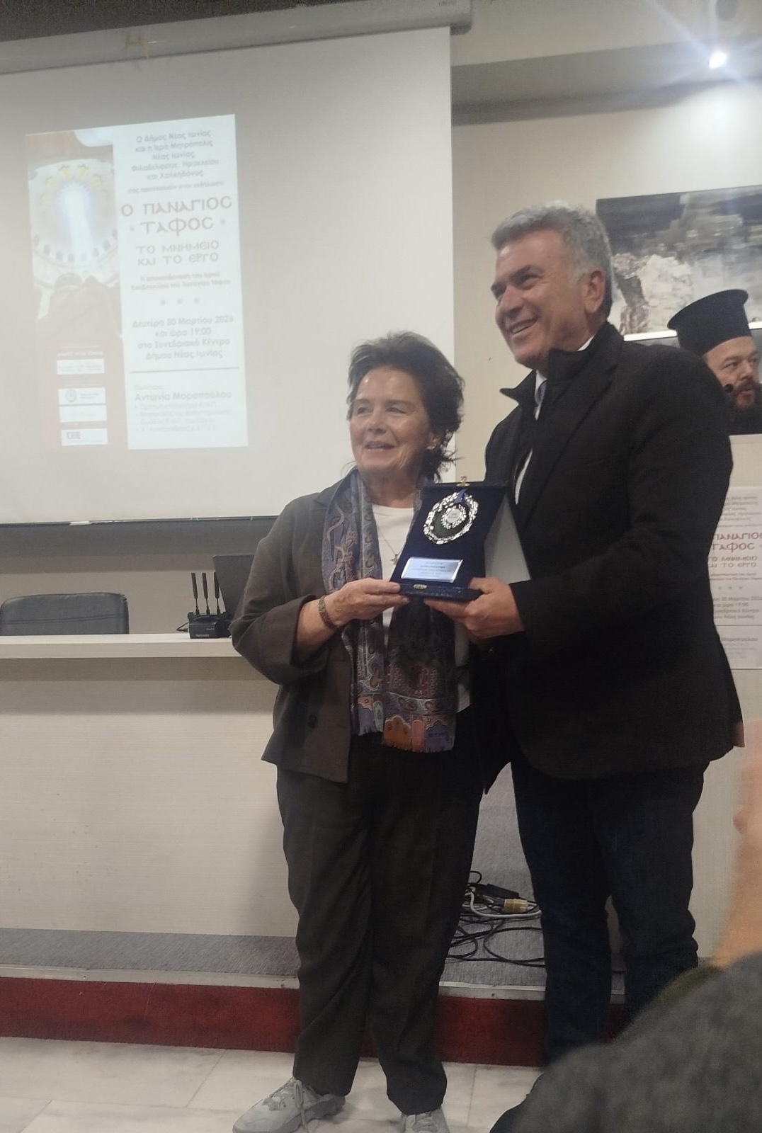 Χαιρετισμό απηύθυνε ο Δήμαρχος Νέας Ιωνίας κ. Παναγιώτης Μανούρης, ο οποίος εξήρε τη σημασία της εκδήλωσης και την διαχρονική αξία του Παναγίου Τάφου ως παγκοσμίου συμβόλου πίστεως, ελπίδος και Αναστάσεως, και στη συνέχεια απένειμε στην κ. Μοροπούλου τιμητική πλακέτα του Δήμου Ν. Ιωνίας.