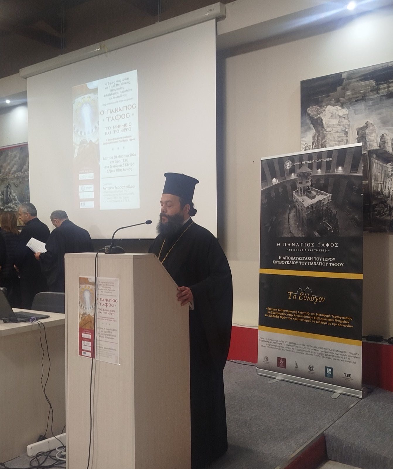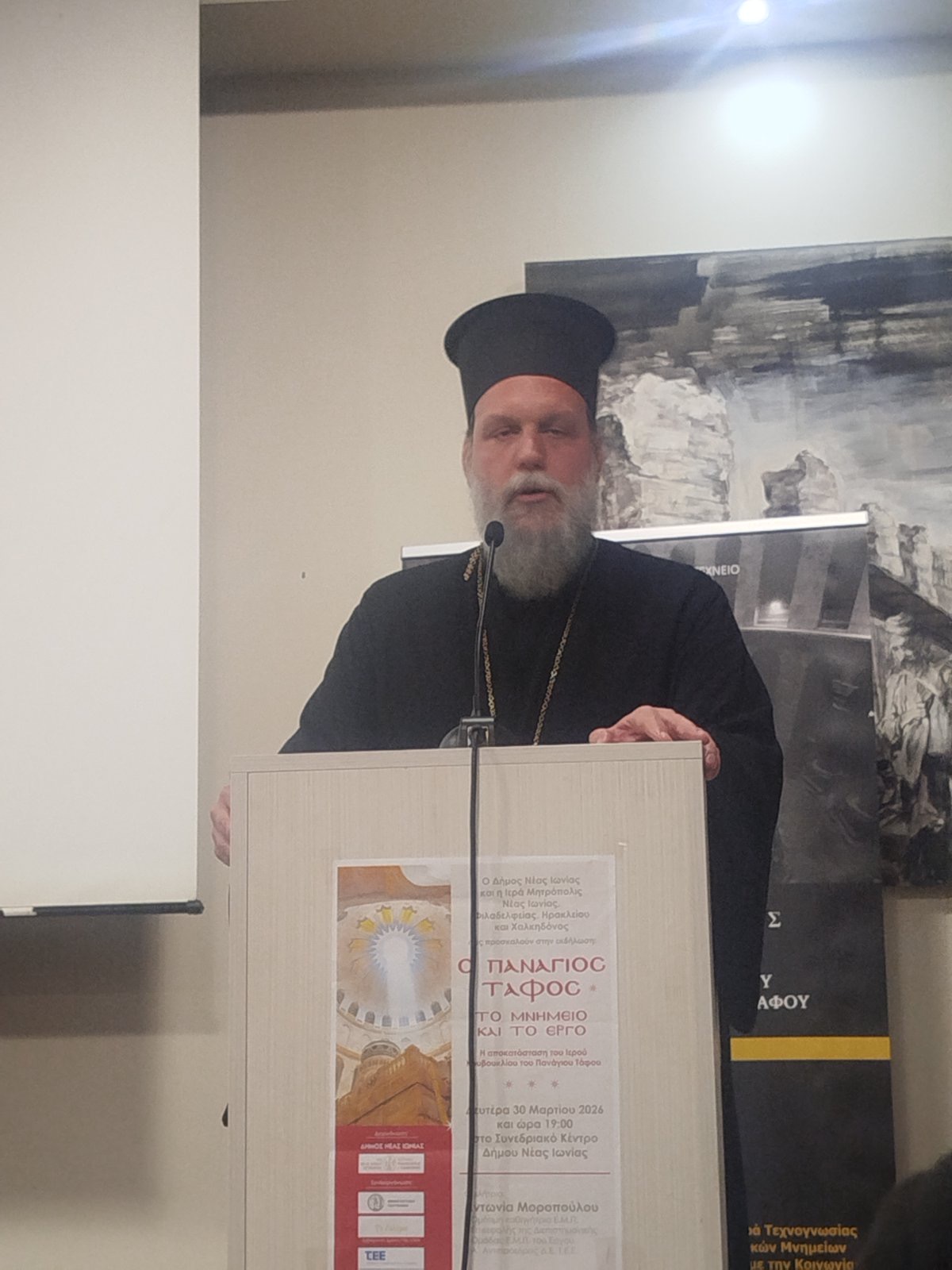 Στον χαιρετισμό του ο Σεβασμιώτατος Μητροπολίτης Νέας Ιωνίας, Φιλαδελφείας, Ηρακλείου και Χαλκηδόνος κ. Γαβριήλ καλωσόρισε με θερμά λόγια την κ. Μοροπούλου, αναφερόμενος στην πολυετή και σημαντική προσφορά της, ιδιαιτέρως δε στο θαυμαστό έργο της για την αποκατάσταση και ανάδειξη του Παναγίου Τάφου.