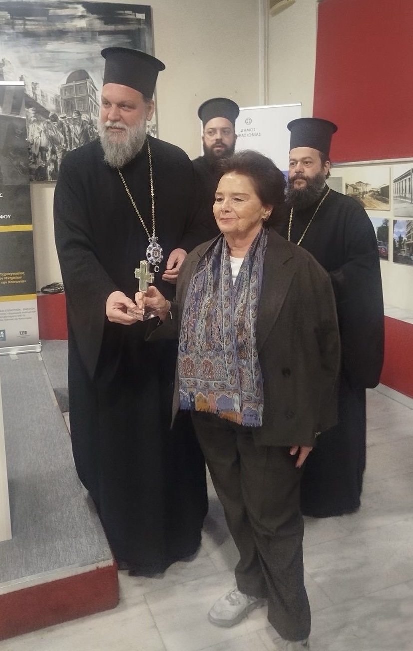 Στη συνέχεια ο Μητροπολίτης κ. Γαβριήλ απένειμε στην κ. Μορόπουλου ως ένδειξη τιμής και ευγνωμοσύνης τον βυζαντινό Σταυρό της Ιεράς Μητροπόλεως Νέας Ιωνίας επί τη συμπληρώσει 50 ετών από την ίδρυση αυτής.
