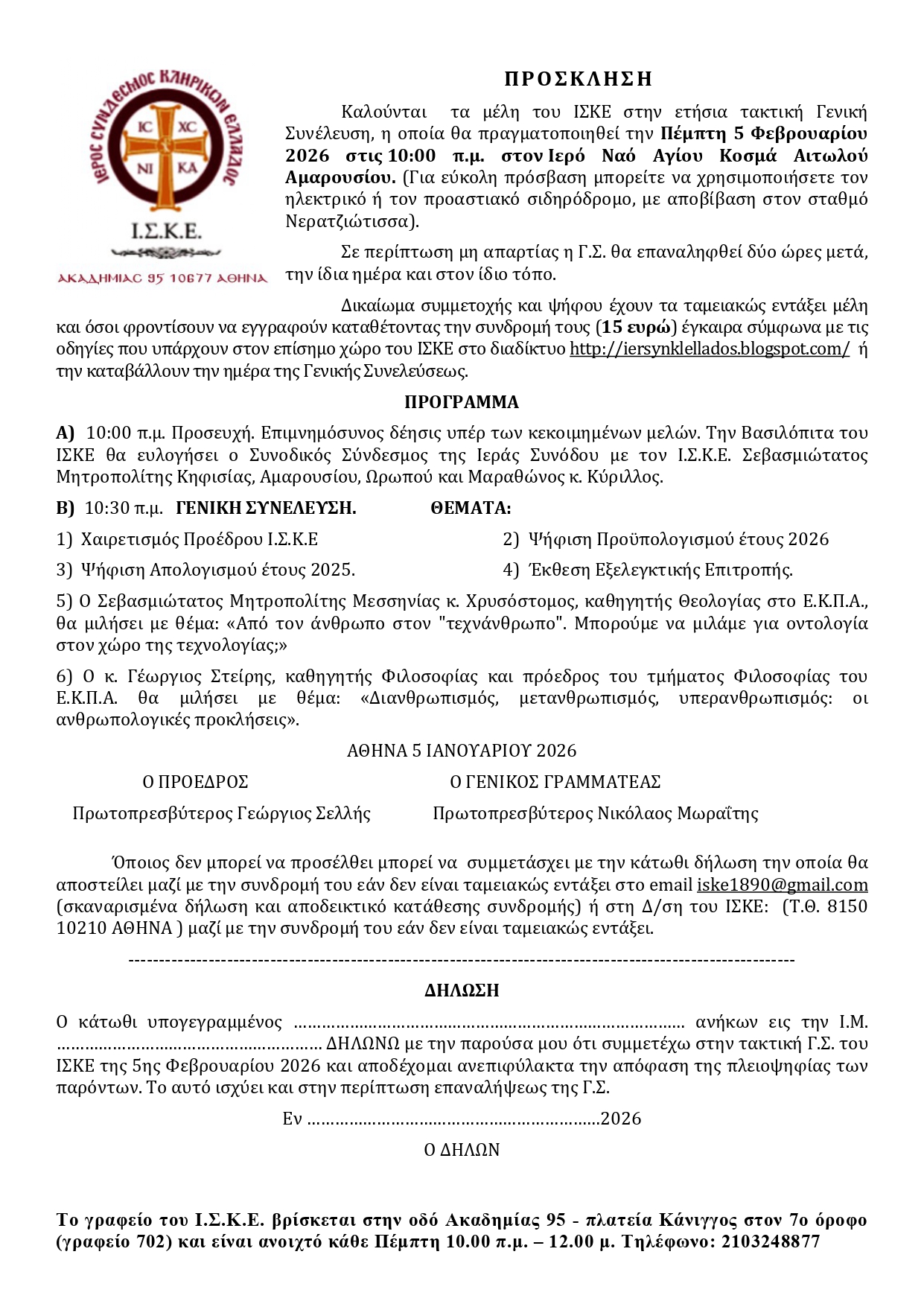 Καλούνται τα μέλη του ΙΣΚΕ στην ετήσια τακτική Γενική Συνέλευση, η οποία θα πραγματοποιηθεί την Πέμπτη 5 Φεβρουαρίου 2026 στις 10:00 π.μ. στον Ιερό Ναό Αγίου Κοσμά Αιτωλού Αμαρουσίου. (Για εύκολη πρόσβαση μπορείτε να χρησιμοποιήσετε τον ηλεκτρικό ή τον προαστιακό σιδηρόδρομο, με αποβίβαση στον σταθμό Νερατζιώτισσα).