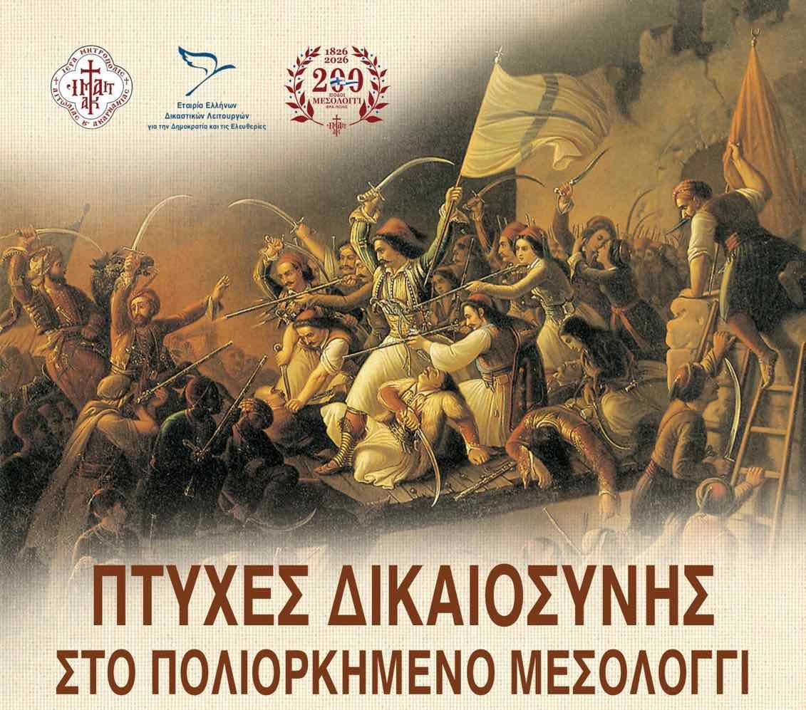 Η Ιερά Μητρόπολη Αιτωλίας και Ακαρνανίας, σε συνεργασία με την Εταιρεία Ελλήνων Δικαστικών Λειτουργών για την Δημοκρατία και τις Ελευθερίες διοργανώνει εκδήλωση με θέμα: «Πτυχές Δικαιοσύνης στο πολιορκημένο Μεσολόγγι».