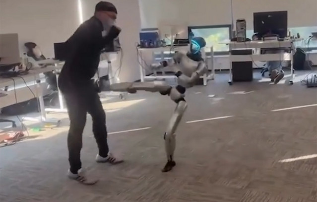 Ένα ξεκαρδιστικό βίντεο αποκαλύπτει τη στιγμή που ένας άνδρας δέχεται κλοτσιά στα γεννητικά όργανα από ένα ανθρωποειδές ρομπότ που μιμείται τις κινήσεις του.