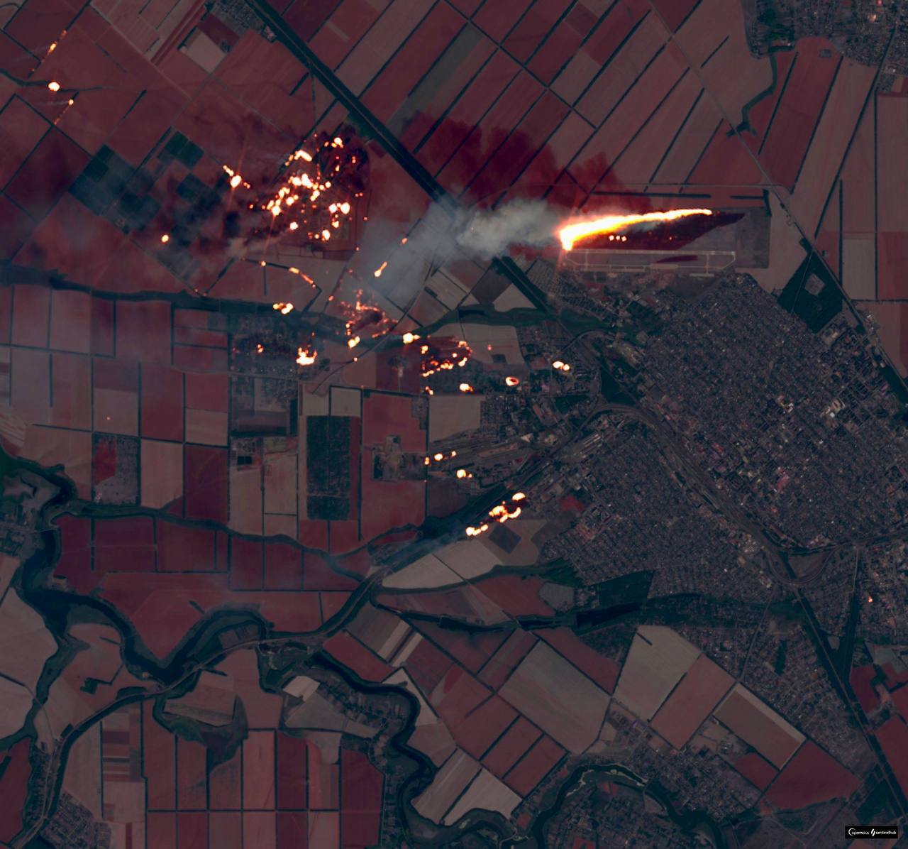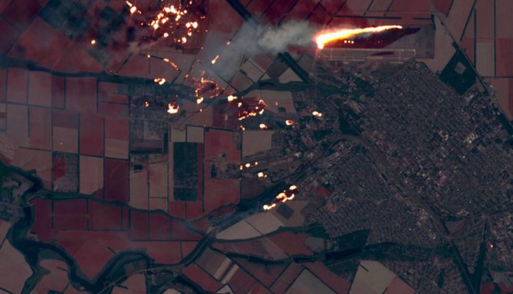 Οι δορυφορικές εικόνες δείχνουν την τοποθεσία να έχει τυλιχθεί πλήρως στις φλόγες, συμπεριλαμβανομένης μιας αεροπορικής βάσης 7 μίλια (11 χλμ.) από την αποθήκη.