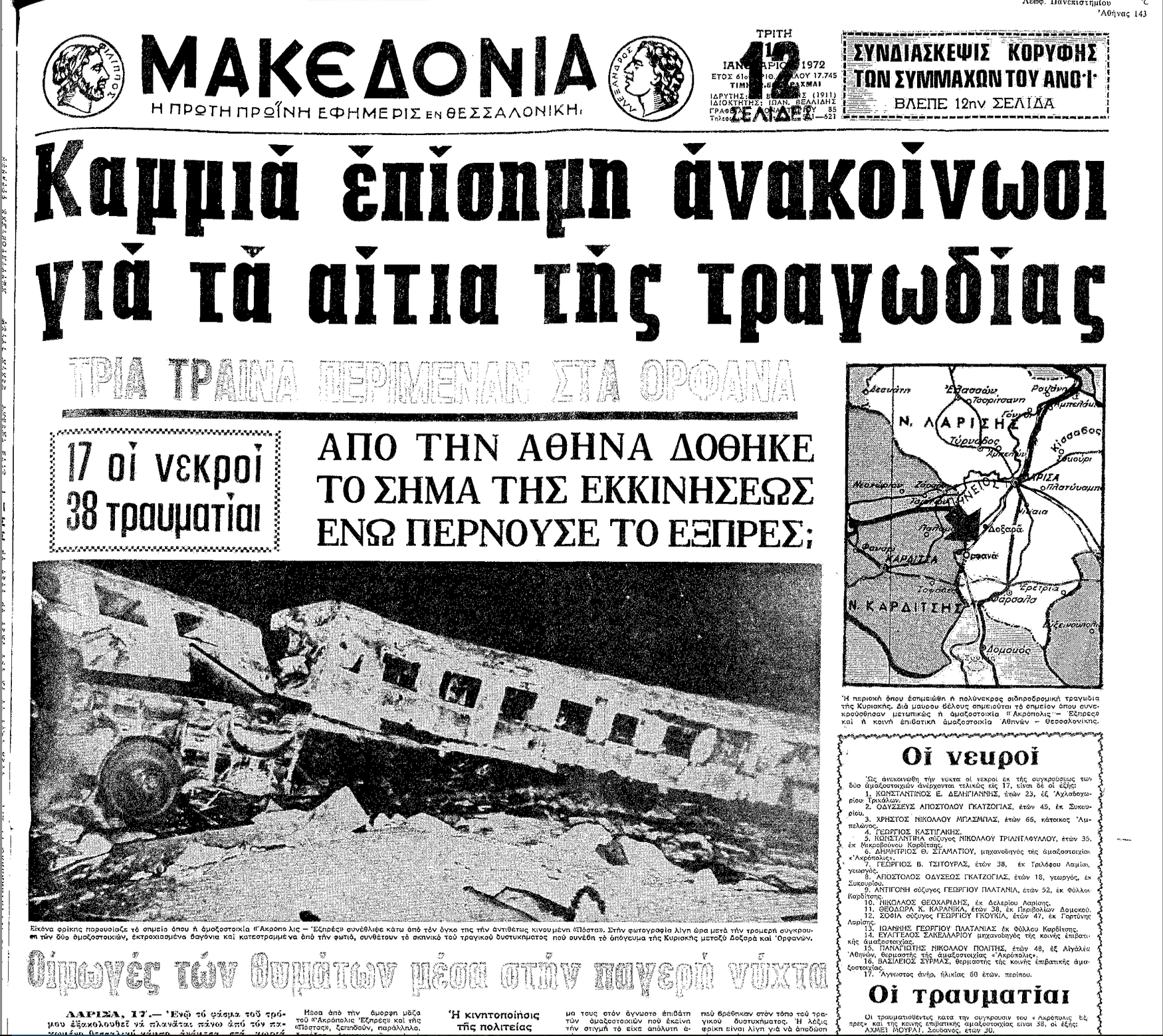 Σαν σήμερα το 1972, στον θεσσαλικό κάμπο, ανάμεσα στους σταθμούς Δοξαρά Λάρισας και Ορφανών Καρδίτσας, γράφεται μία από τις πιο σκοτεινές σελίδες στην ιστορία των ελληνικών σιδηροδρόμων. Η υπερταχεία «Ακρόπολις Εξπρές», που ερχόταν από την Κεντρική Ευρώπη προς την Ελλάδα, συγκρούεται μετωπικά σε μονή γραμμή με την επιβατική αμαξοστοιχία που οι άνθρωποι της εποχής αποκαλούσαν «πόστα», επειδή μετέφερε και ταχυδρομείο.