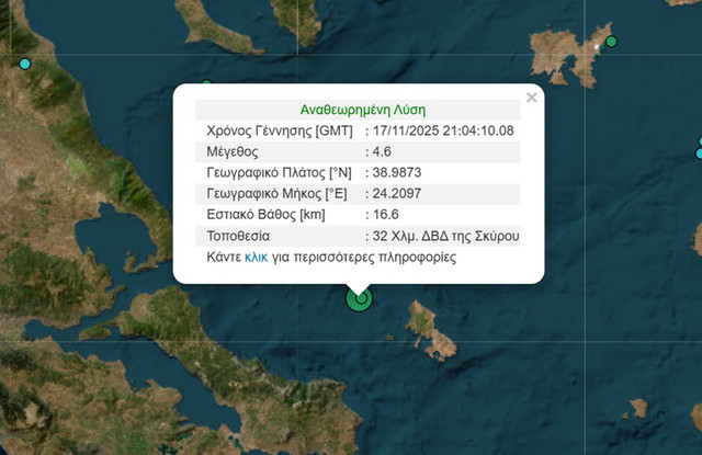 Το εστιακός βάθος καταγράφηκε στα 16,6 χλμ με το επίκεντρο να είναι 32 χλμ βορειοδυτικά της Σκύρου.