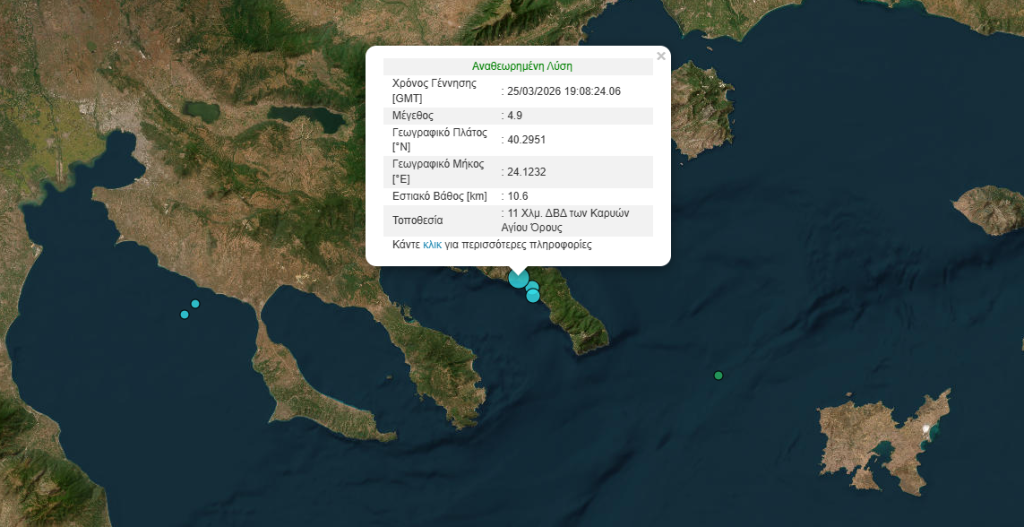 Ισχυρή σεισμική δόνηση 4,9 βαθμών της κλίμακας Ρίχτερ σημειώθηκε το βράδυ της Τετάρτης 25 Μαρτίου στις 21:08, 8 χιλιόμετρα ΒΔ των Καρυών Αγίου Όρους, περιοχή που έχουν σημειωθεί τα τελευταία χρόνια και άλλες σεισμικές δονήσεις.