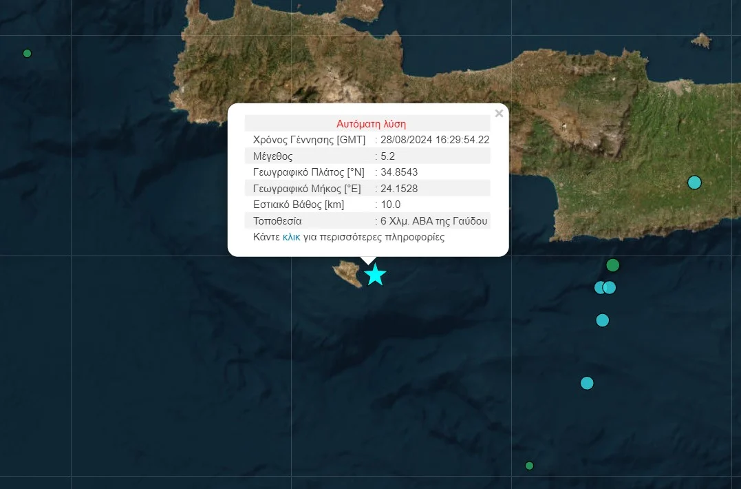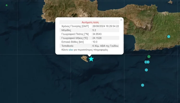 Σύμφωνα με την εκτίμηση του Γεωδυναμικού Ινστιτούτου ο σεισμός σημειώθηκε το απόγευμα της Τετάρτης (28/8) στις 19:29 στη θαλάσσια περιοχή νότια της Κρήτης με ένταση 5,2 βαθμούς της κλίμακας Ρίχτερ.