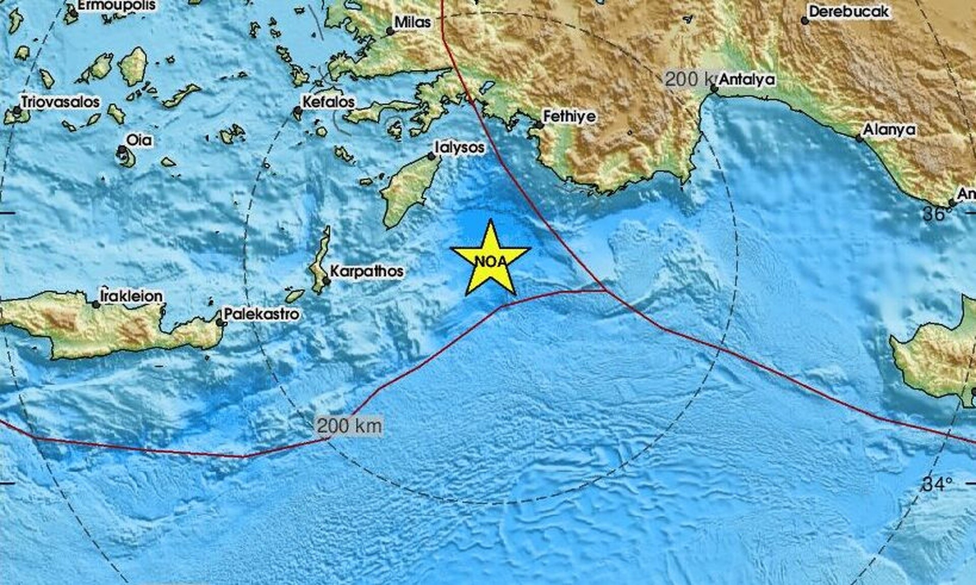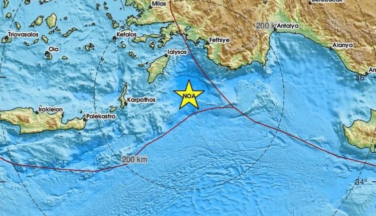 Το ακριβές επίκεντρο της δόνησης εντοπίζεται, 86 χλμ. νοτιοανατολικά από το Αφάντου της Ρόδου.