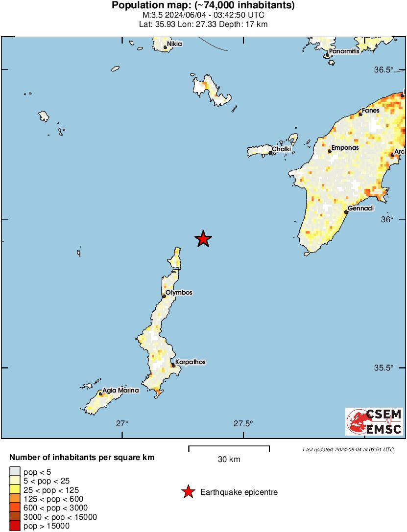 Σύμφωνα με την αυτόματη αναθεωρημένη λύση του Ευρωπαϊκού – Μεσογειακού Σεισμολογικού Κέντρου (EMSC), σημειώθηκε το πρωί της Τρίτης (4/6) στις 06:42, σε υποθαλάσσια περιοχή, στο στενό μεταξύ Κάρπαθου και Ρόδου.