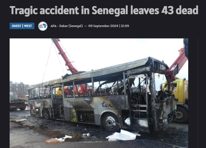 43 άνθρωποι σκοτώθηκαν και 22 τραυματίστηκαν σήμερα το πρωί στο κέντρο της Σενεγάλης, σε μια σύγκρουση λεωφορείου με φορτηγό. Μεταξύ των 43 θυμάτων, 16 πτώματα βρέθηκαν εντελώς απανθρακωμένα, δυσκολεύοντας την αναγνώριση τους σύμφωνα με το AfricanPressAgency.