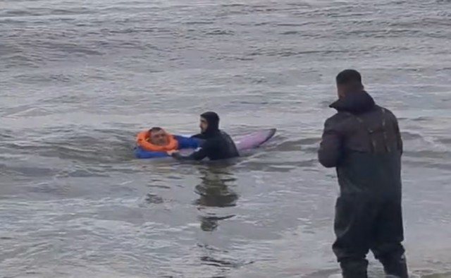 Για καλή τους τύχη ένας νεαρός σέρφερ από διπλανή παραλία εμφανίστηκε ξαφνικά. Ο 31χρονος Νίκος Μαυρίδης, γνώστης του σερφ από τα 15 του χρόνια, βούτηξε στα παγωμένα νερά χωρίς δισταγμό, επιχειρώντας τη διάσωση. Σιγά σιγά κατάφερε να φέρει τον ψαρά στην ακτή, με τη βοήθεια μιας ανθρώπινης αλυσίδας που σχηματίστηκε για να τον μεταφέρουν κοντά στη φωτιά.