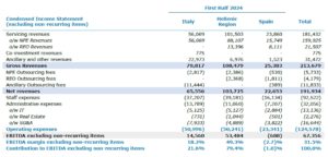 - Σε ό,τι αφορά τη λειτουργική κερδοφορία, όμως, ο ελληνικός χώρος έχει με μεγάλη διαφορά τη μεγαλύτερη συνεισφορά. Τα κέρδη προ φόρων, τόκων και αποσβέσεων (EBITDA), χωρίς να υπολογίζεται τα μη επαναλαμβανόμενα, ήταν περίπου 53,5 εκατ. ευρώ από τον ελληνικό χώρο, έναντι μόλις 14,6 εκατ. από την Ιταλία και ζημιών 688.000 ευρώ στην Ισπανία. Ο ελληνικός χώρος συνεισέφερε σχεδόν 8 στα 10 ευρώ λειτουργικού κέρδους του ομίλου (ποσοστό 79,4%)!