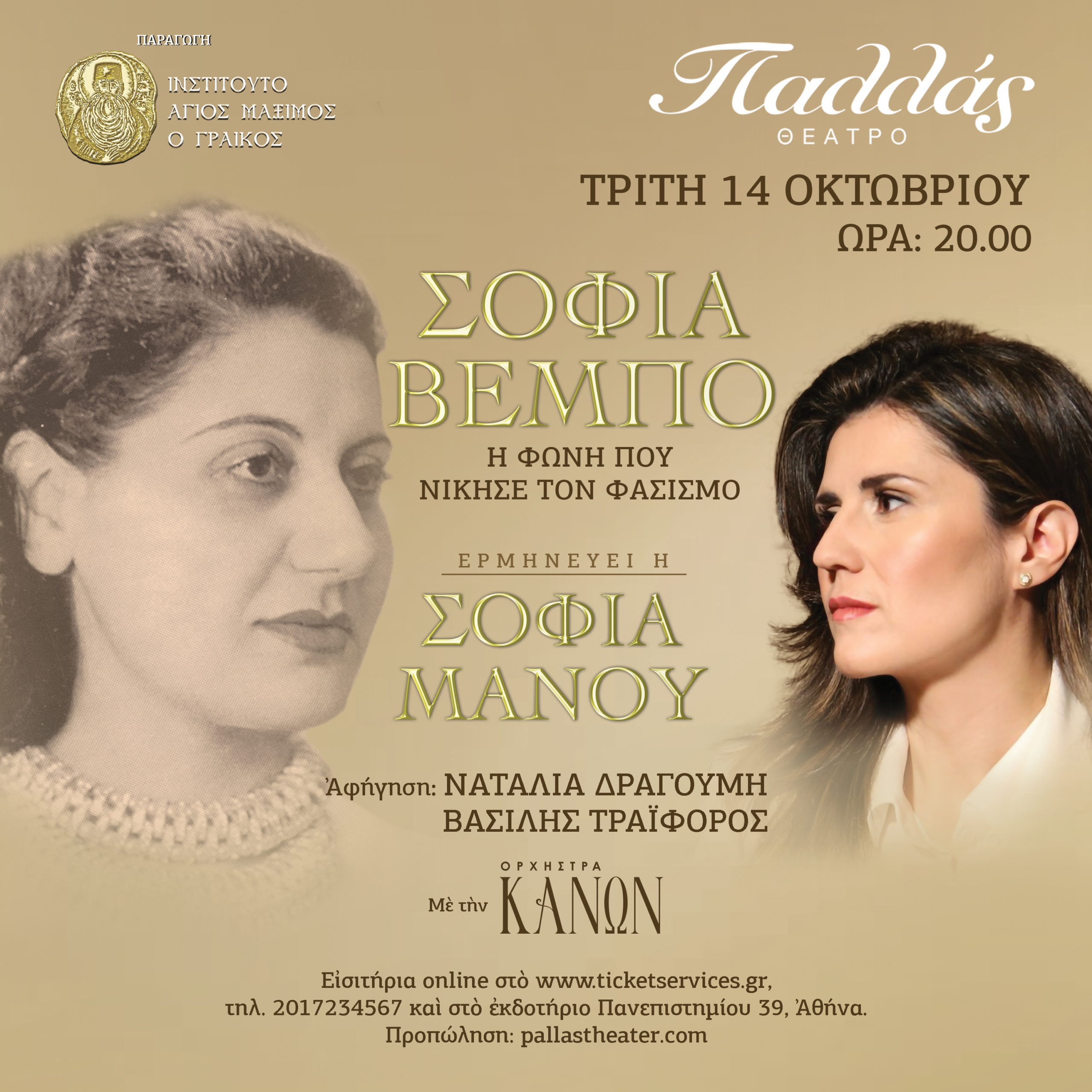 Η παράσταση «Σοφία Βέμπο – Η φωνή που νίκησε τον φασισμό», με αφορμή τον ομώνυμο δίσκο που κυκλοφόρησε το 2020 με τη Σοφία Μάνου, από το Ινστιτούτο Άγιος Μάξιμος ο Γραικός, θα παρουσιαστεί την Τρίτη 14 Οκτωβρίου, στις 20:00, στο θέατρο Παλλάς, ξυπνώντας μνήμες από το έπος του ’40 και φέρνοντας στο φως την αιώνια δύναμη της τέχνης απέναντι στο σκοτάδι.