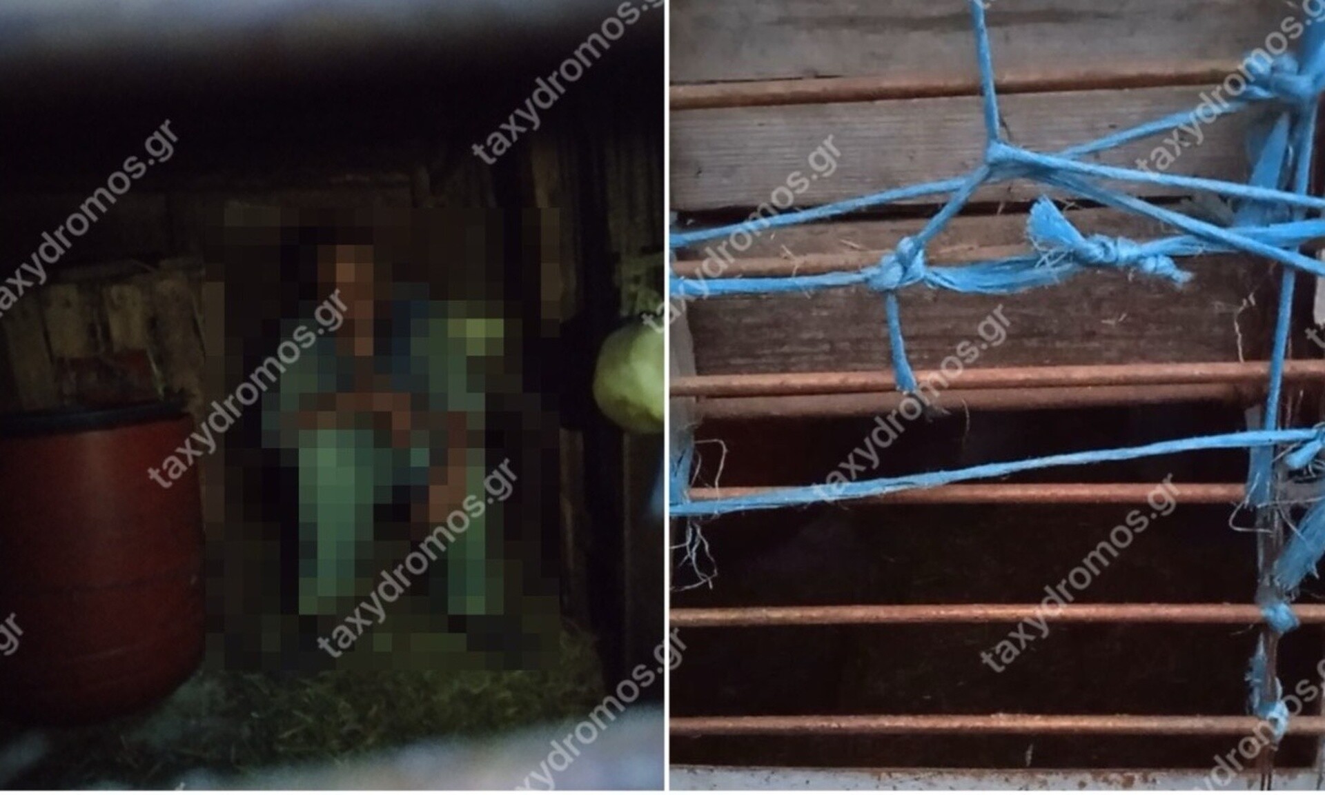 Από το μικρό παράθυρο της πόρτας που φέρει αυτοσχέδια κάγκελα, φαινόταν ο 45χρονος ΑμεΑ, ο οποίος καθόταν σε ένα τσιμεντόλιθο ανάμεσα σε άχυρα, σκυμμένος. Πληροφορίες αναφέρουν ότι ήταν χτυπημένος στο μάτι και στην περιοχή του λαιμού.