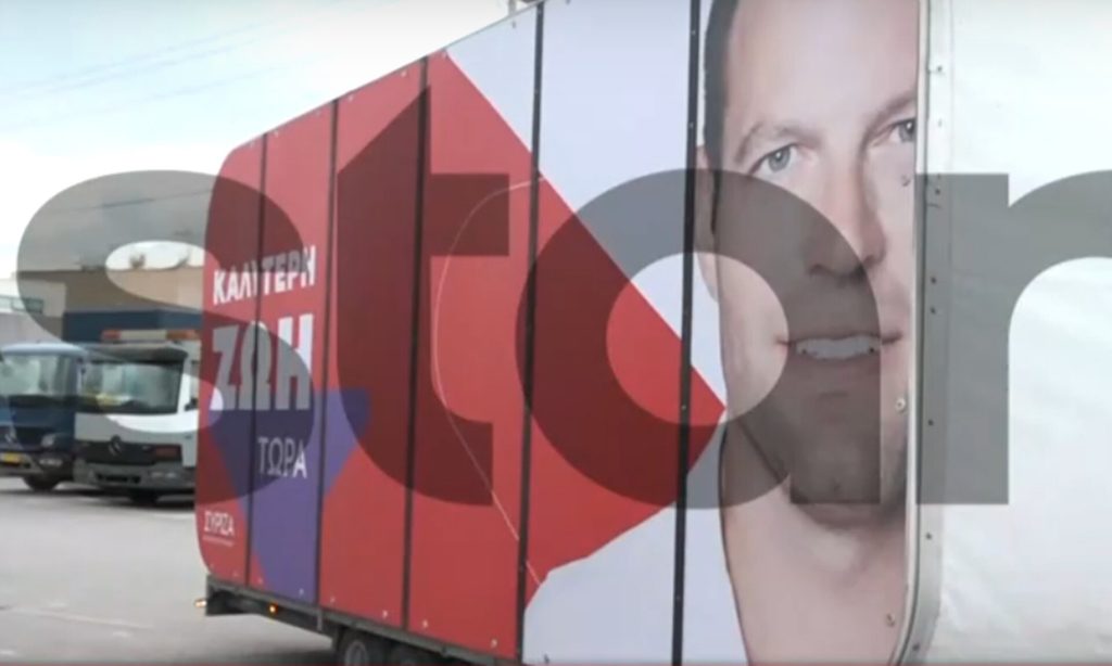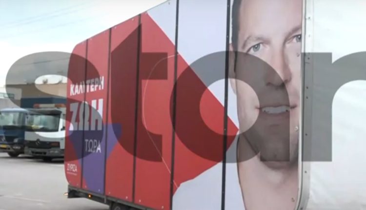 Το σύνθημα «καλύτερη ζωή τώρα» αναγράφεται στο τροχόσπιτο ενώ υπάρχει και η φωτογραφία του Στέφανου Κασσελάκη